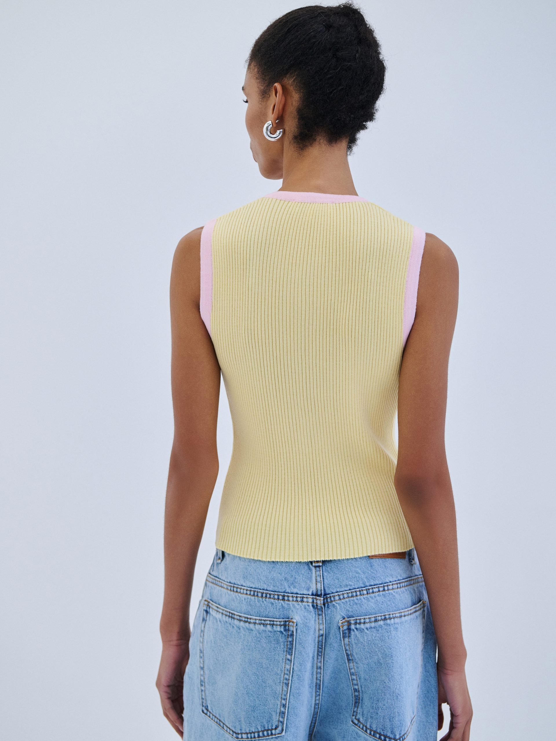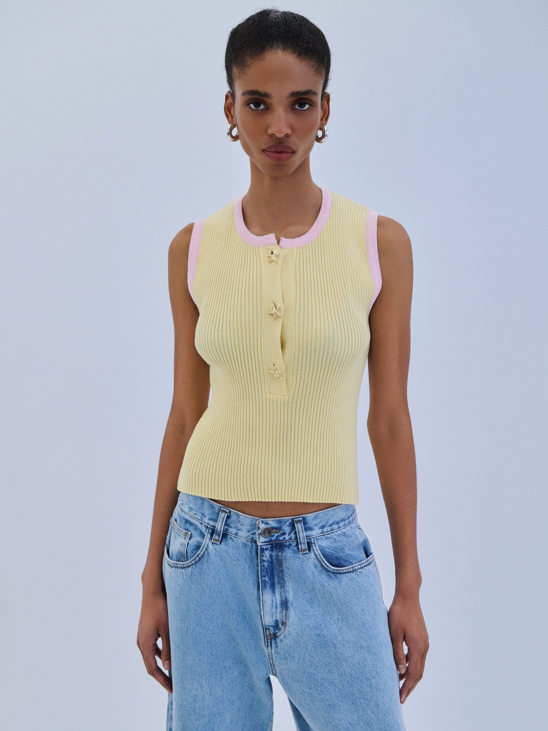 Αμάνικη πλεκτή μπλούζα σε κίτρινο χρώμα με ροζ λεπτομέρειες.