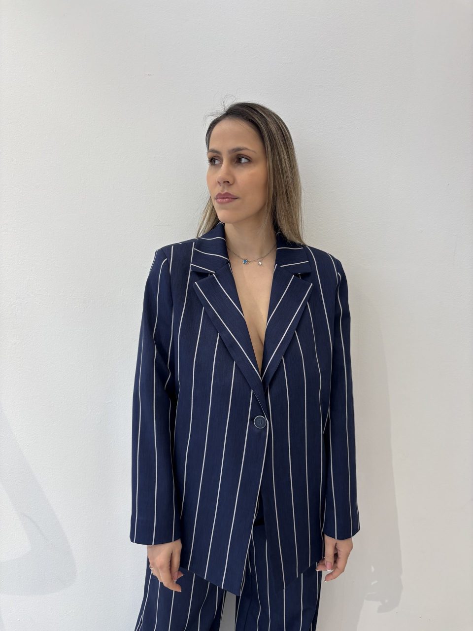 Σακάκι σε σκούρο μπλε χρώμα με λευκή ρίγα.