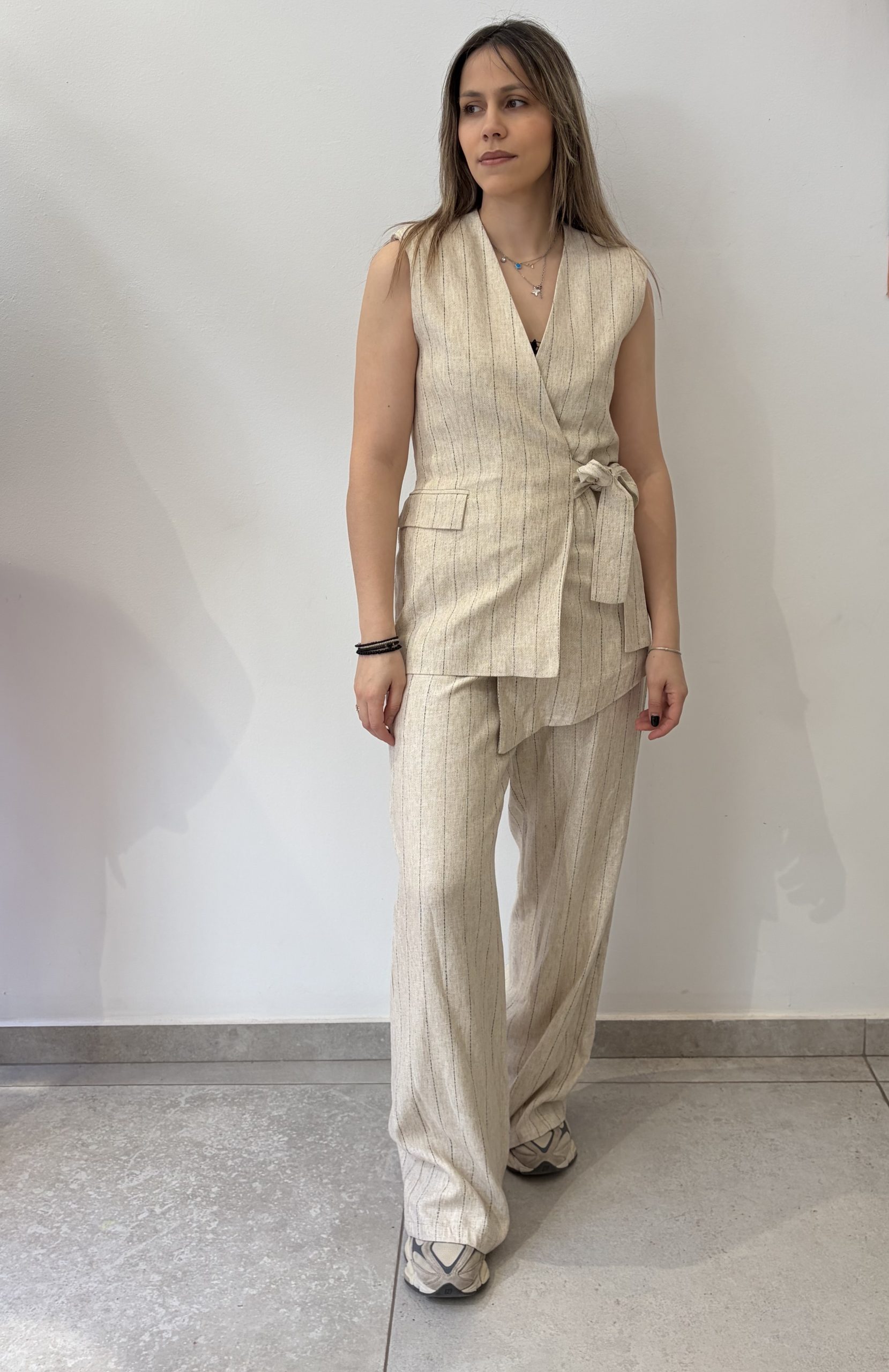 Σετ γιλέκο με παντελόνι ριγέ σε εκρού χρώμα.