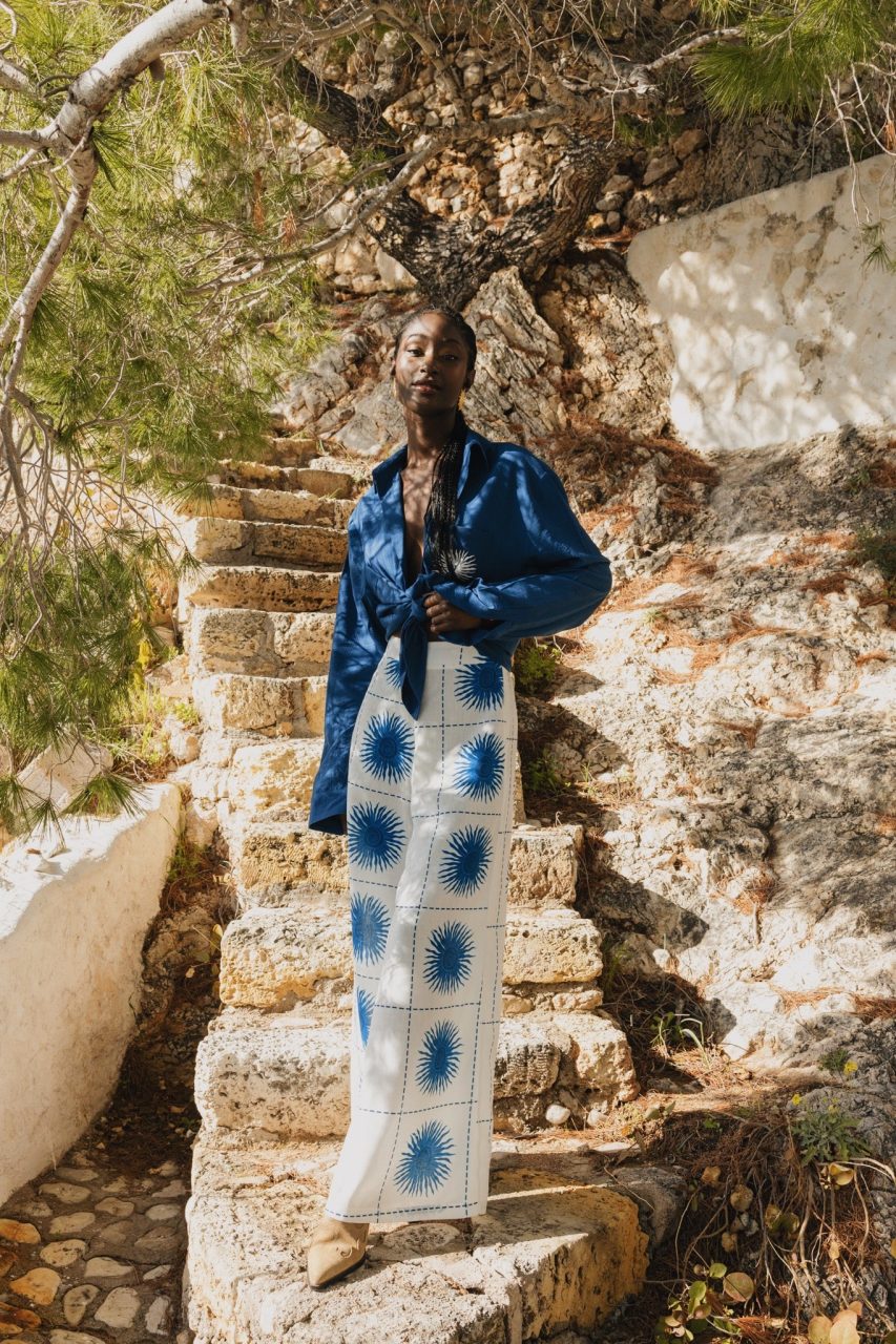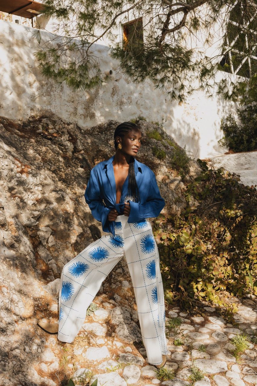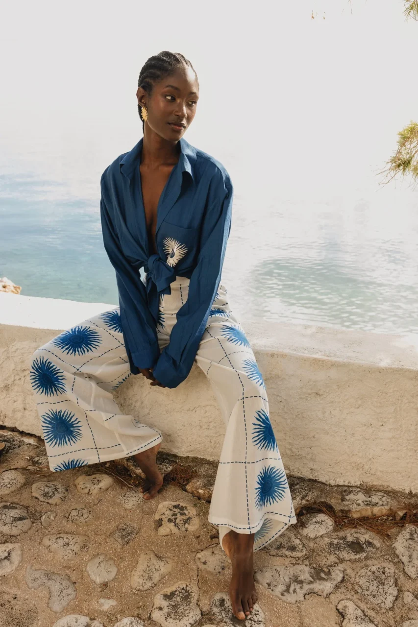 Παντελόνι με μοτίβο μπλε αποχρώσεις σε λευκό φόντο.
