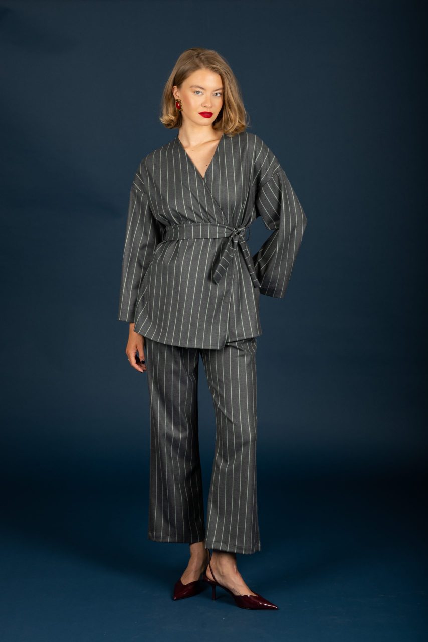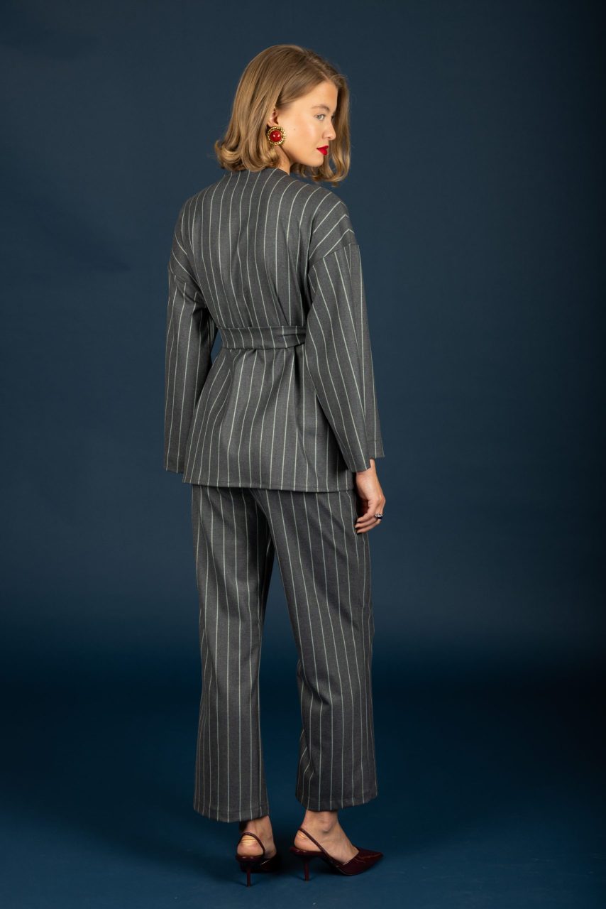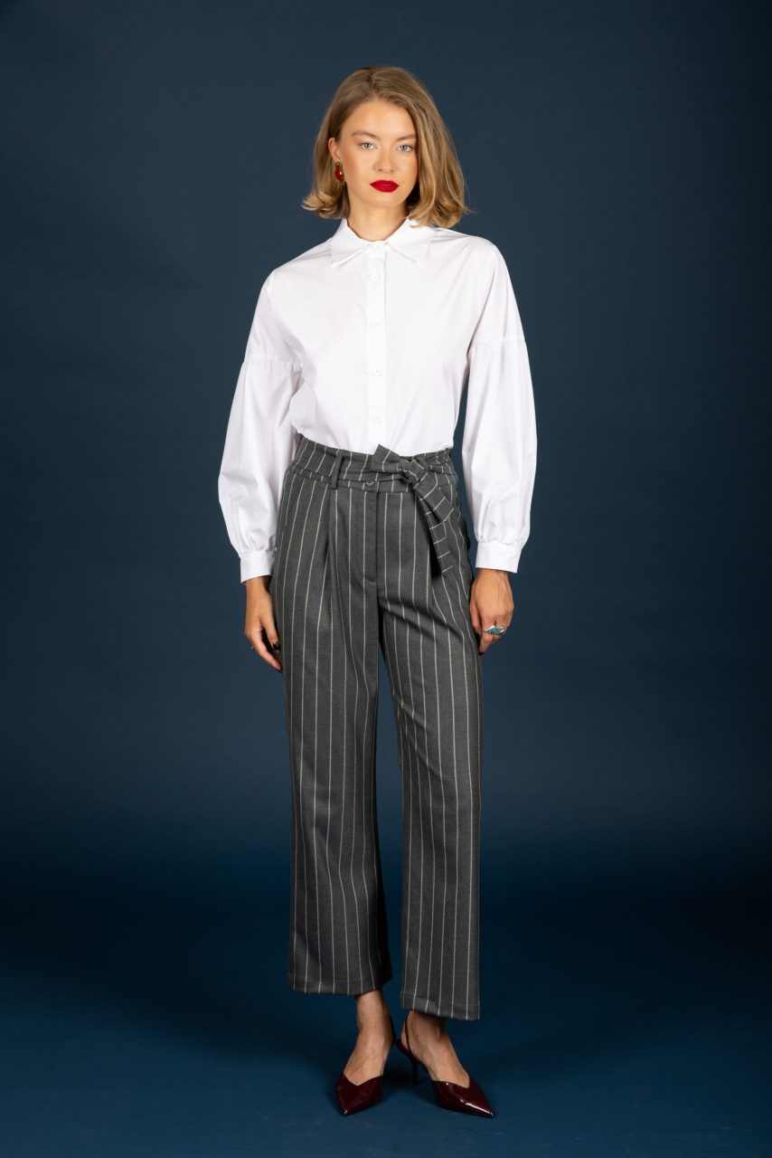Ριγέ παντελόνι σε αποχρώσεις του γκρι και λευκού.
