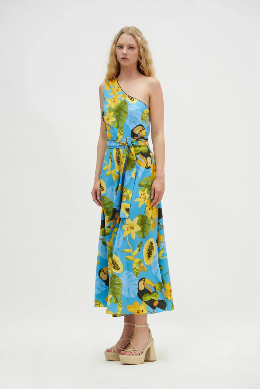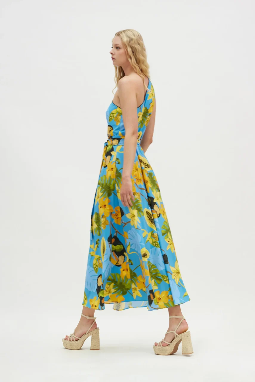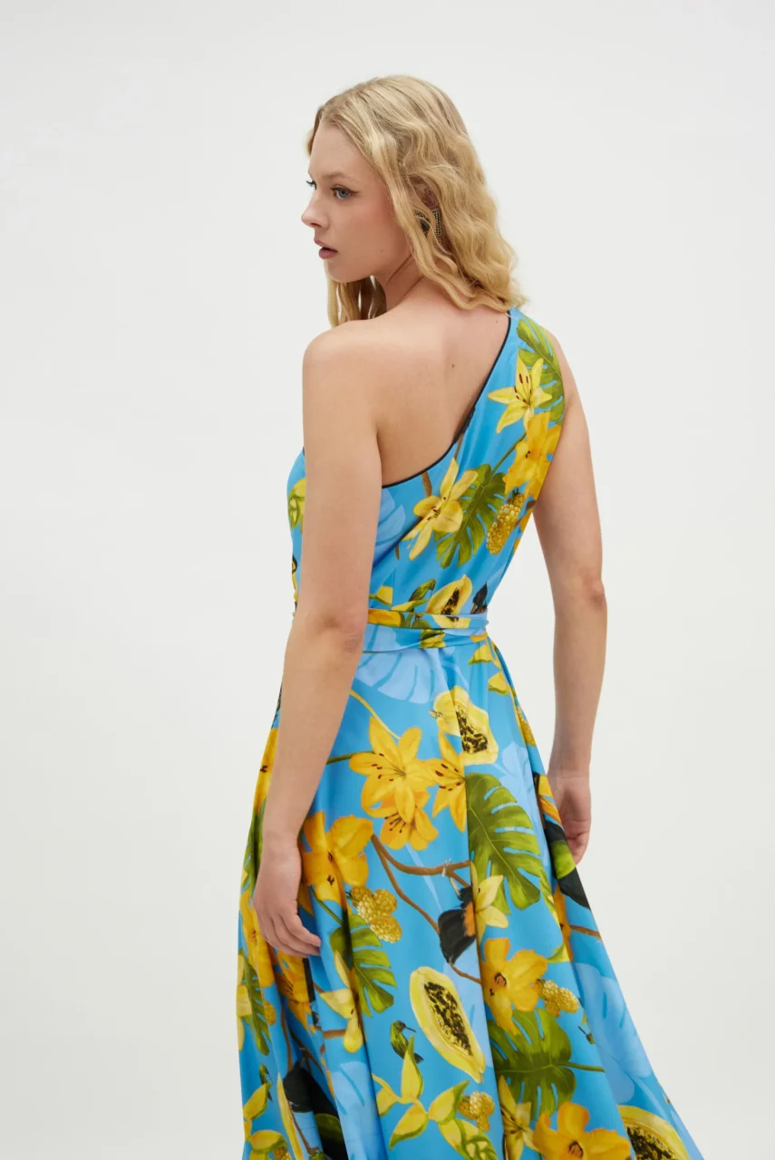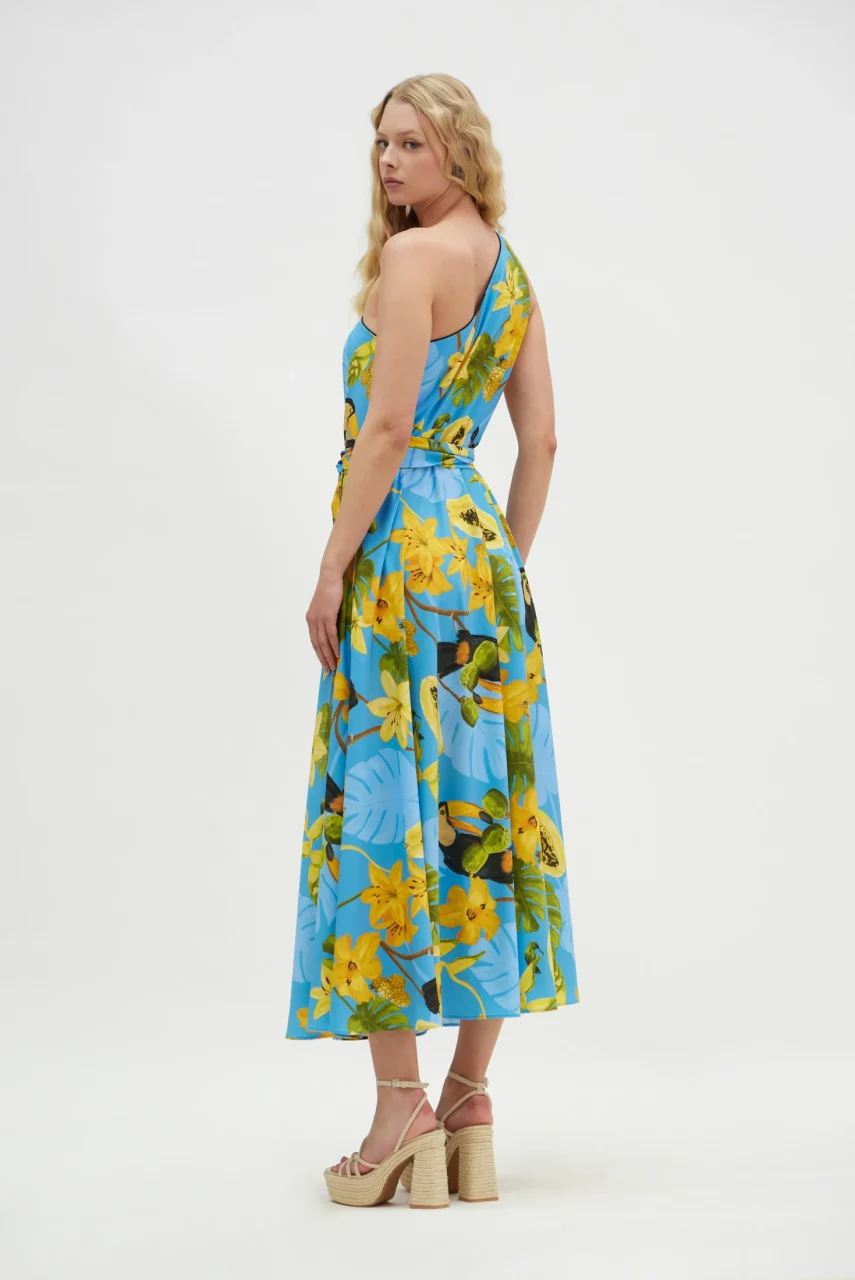 - Pattern με πουλιά και λουλούδια του τροπικού δάσους σε capri blue φόντο