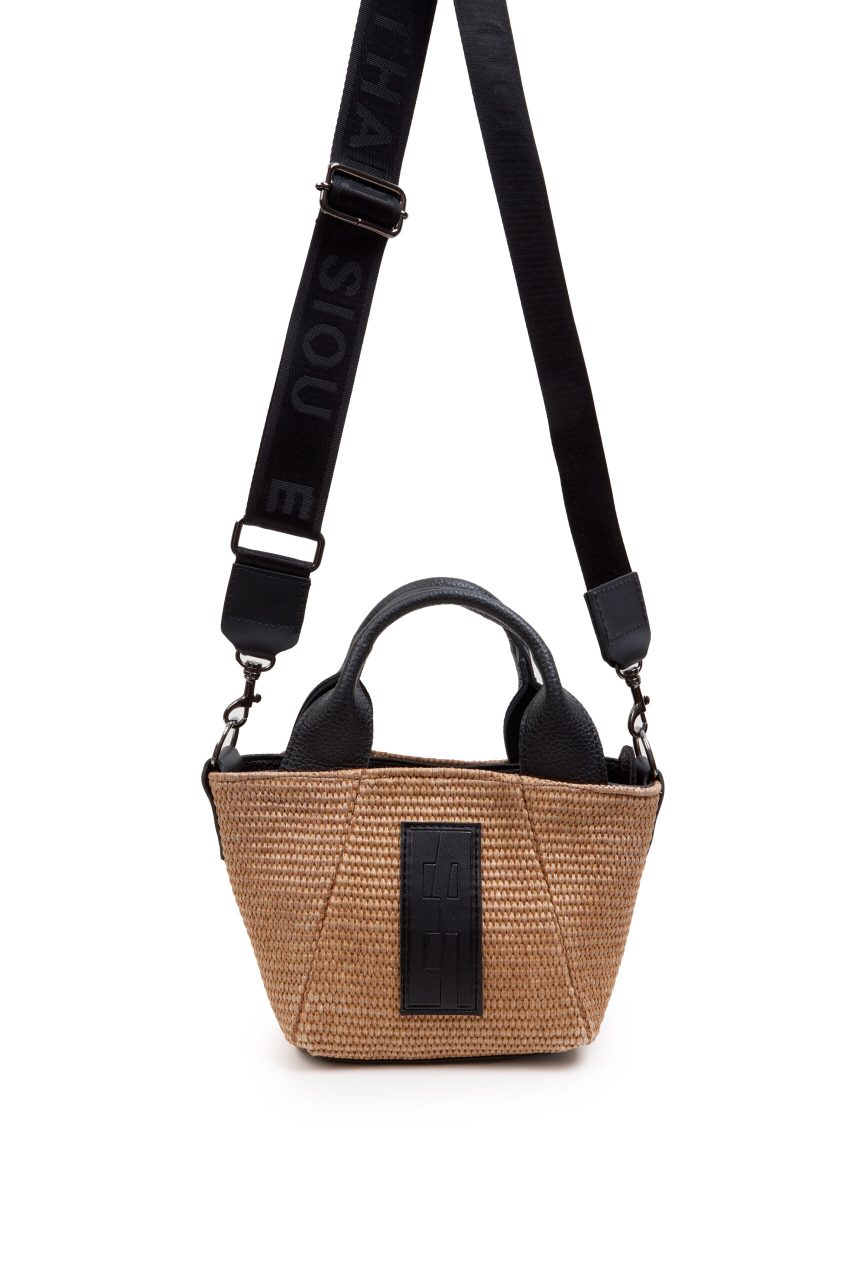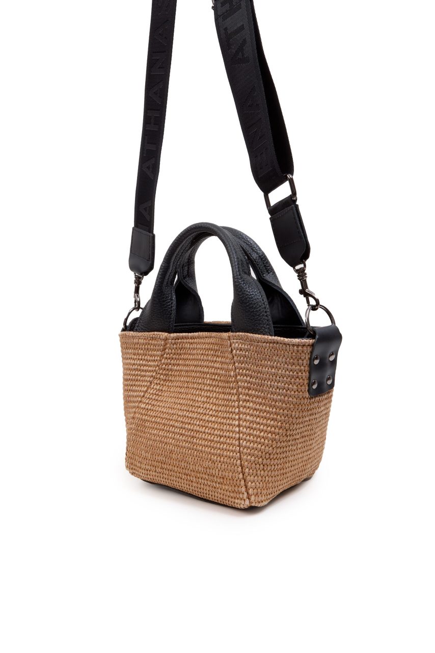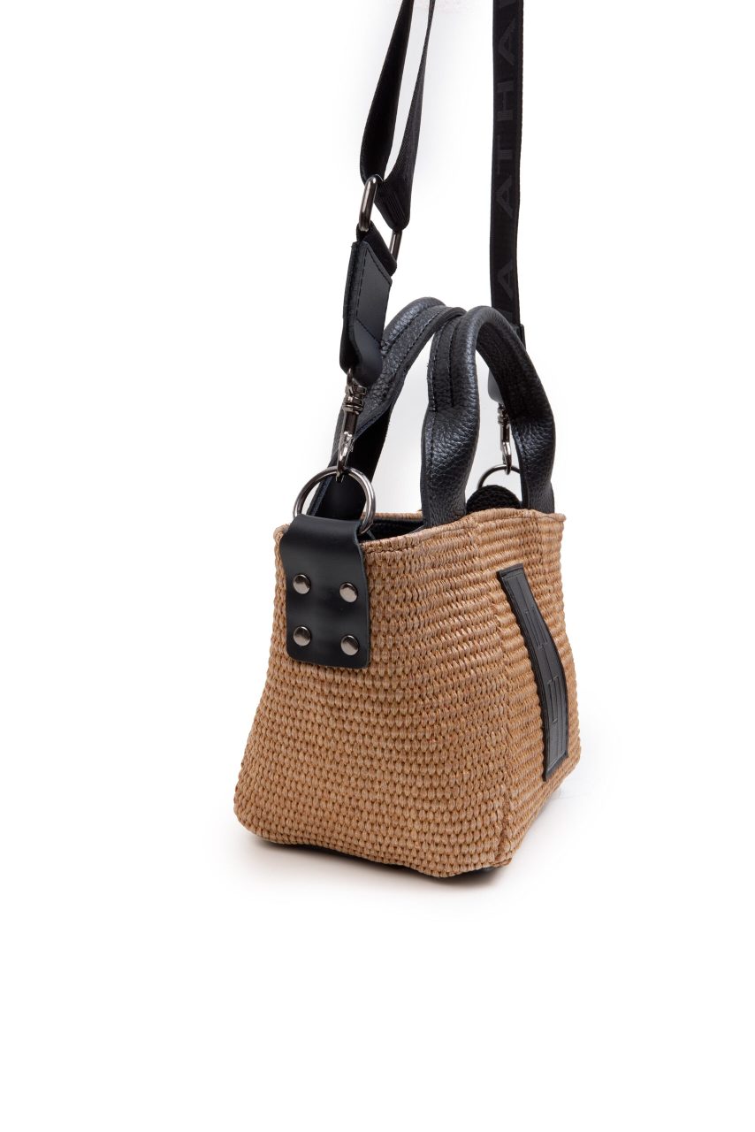 Τσάντα χειρός/χιαστί ψάθινη σε μικρό μέγεθος και καφέ/μπεζ χρώμα.