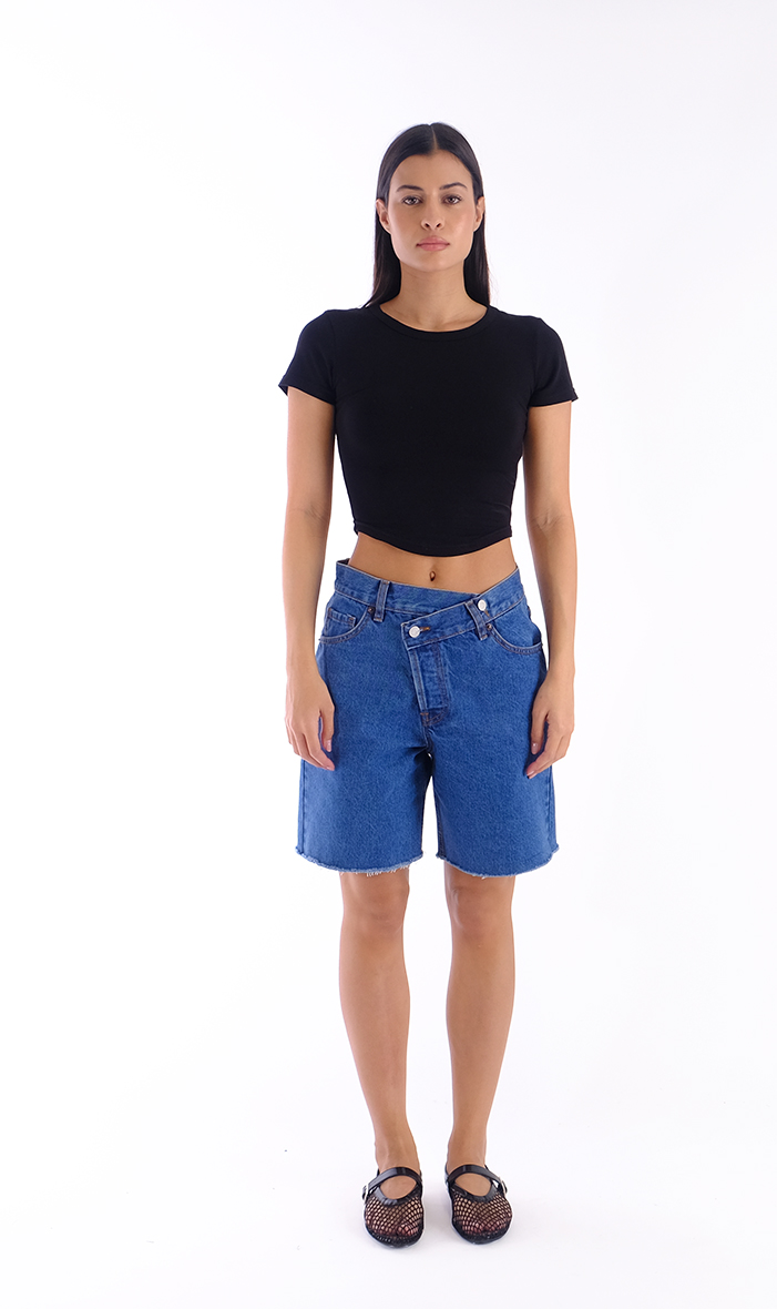 Τζιν σορτς με ασύμμετρο κούμπωμα.