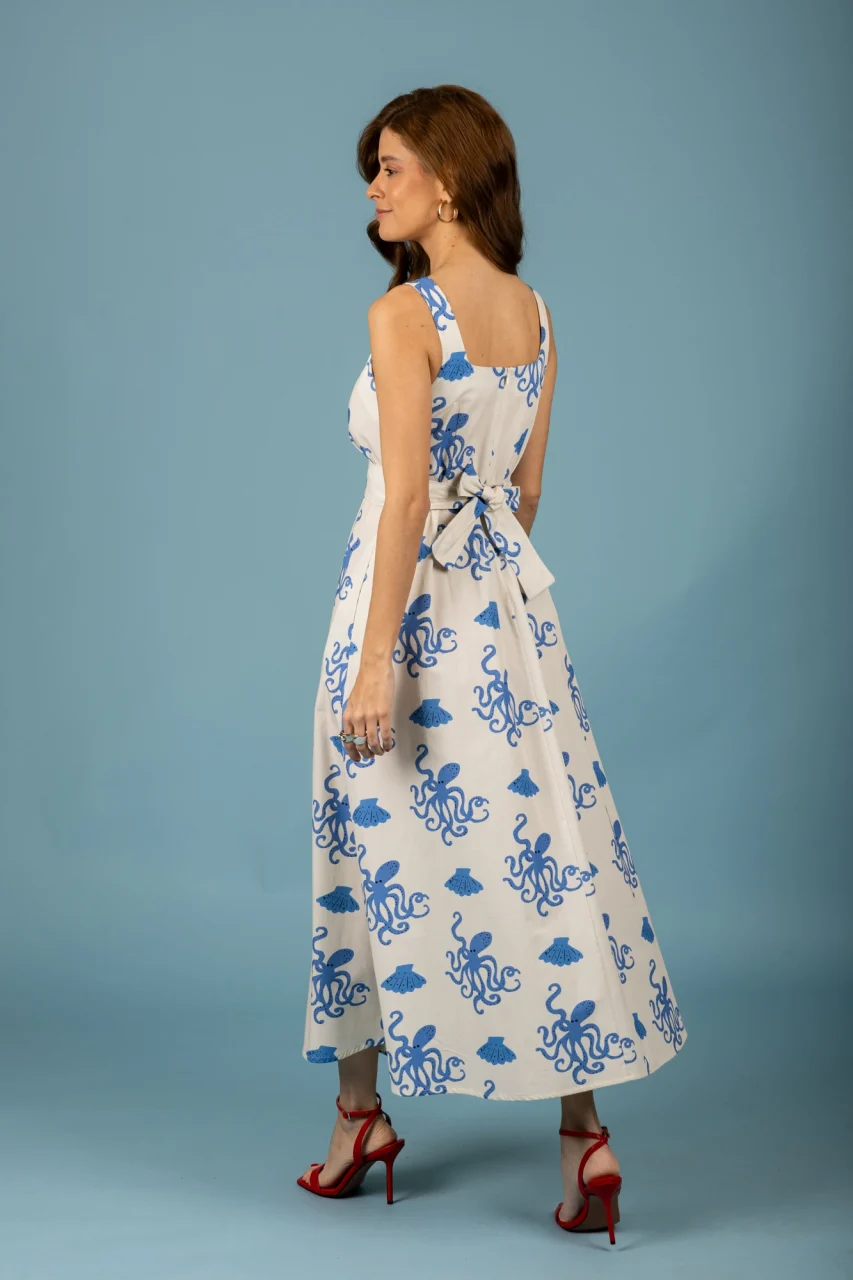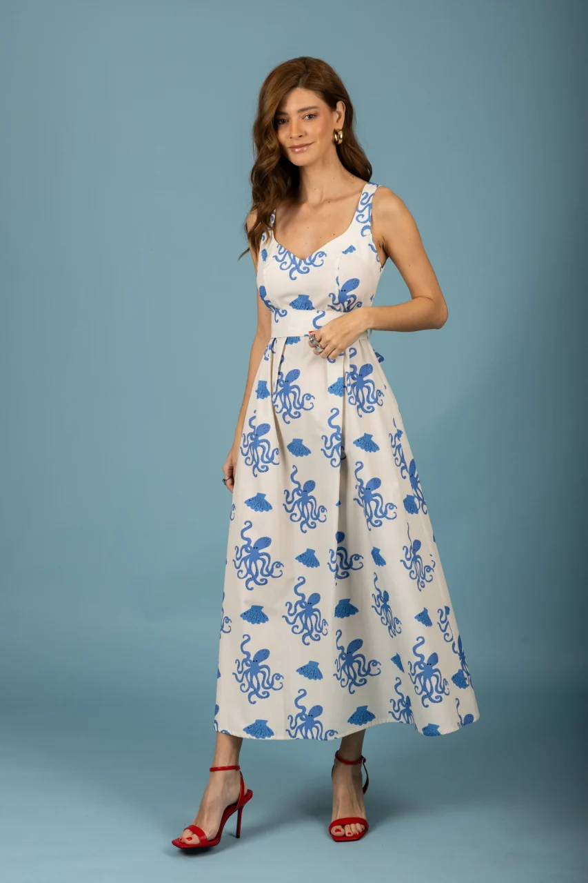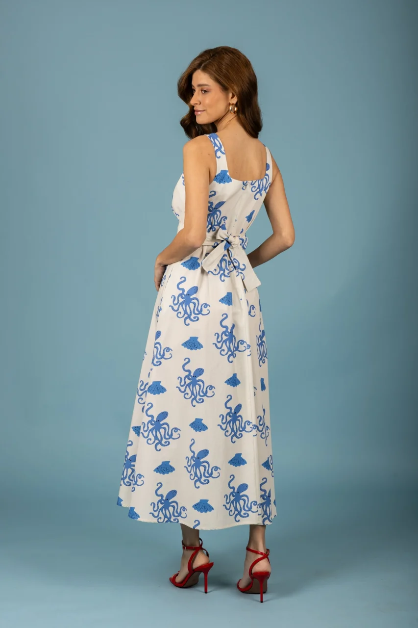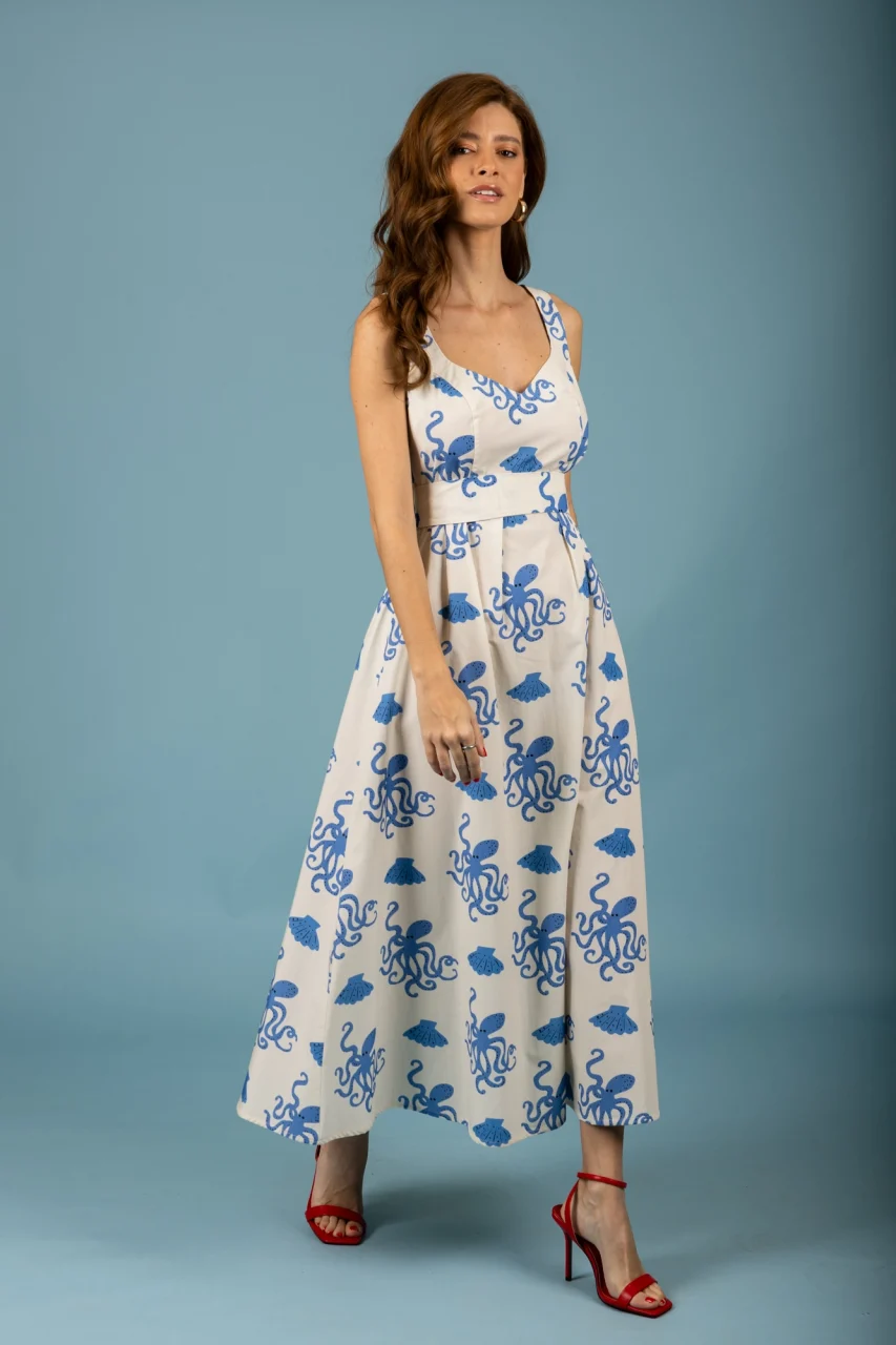 Βαμβακερό μακρύ φόρεμα σε εκρού χρώμα με μοτίβο χταπόδια.