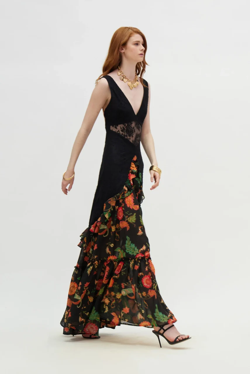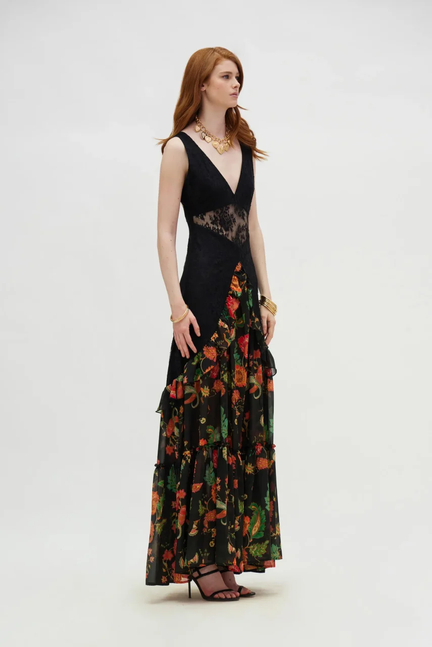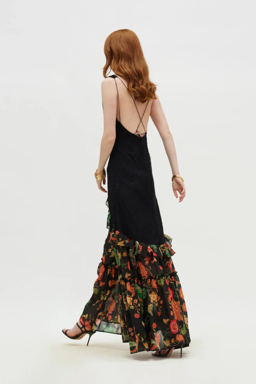 Μακρύ φόρεμα με λαχούρια σε μαύρο φόντο και δαντέλα.