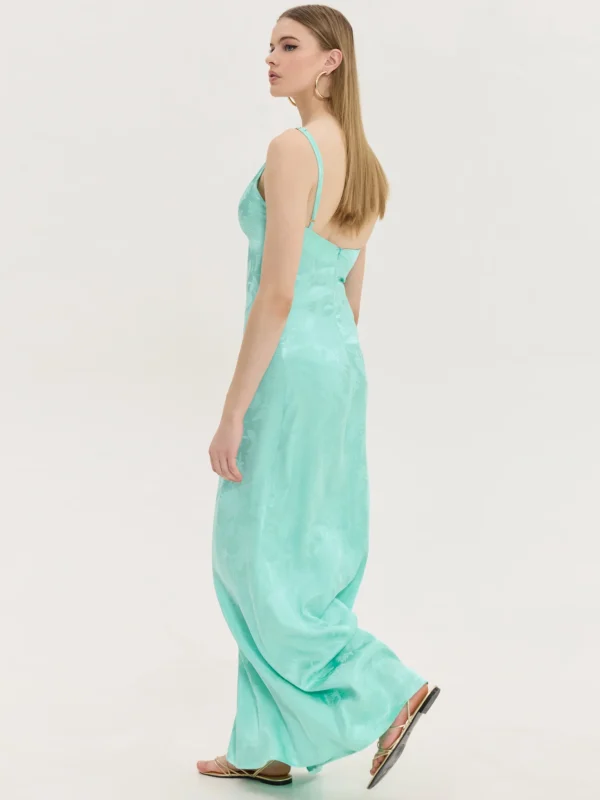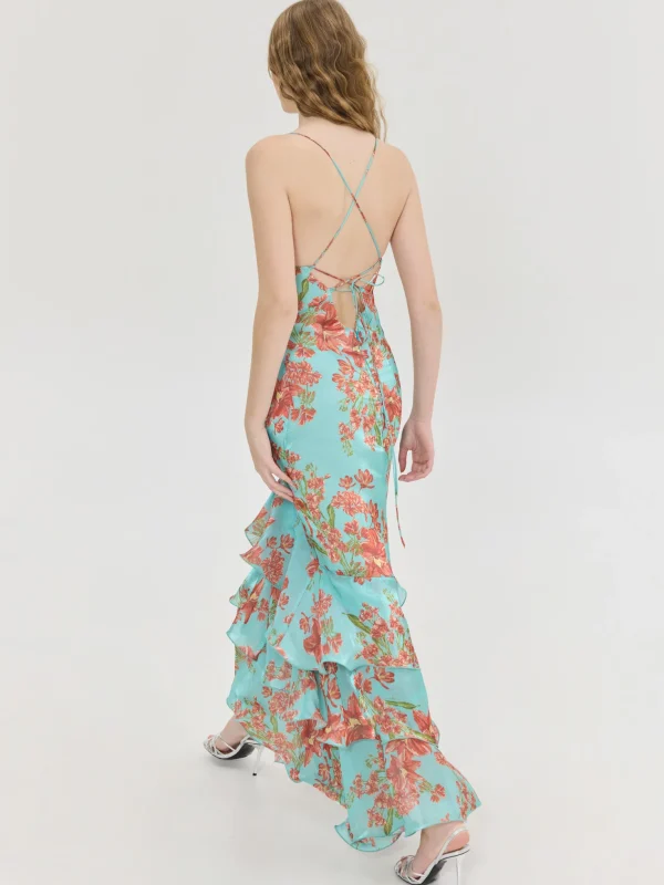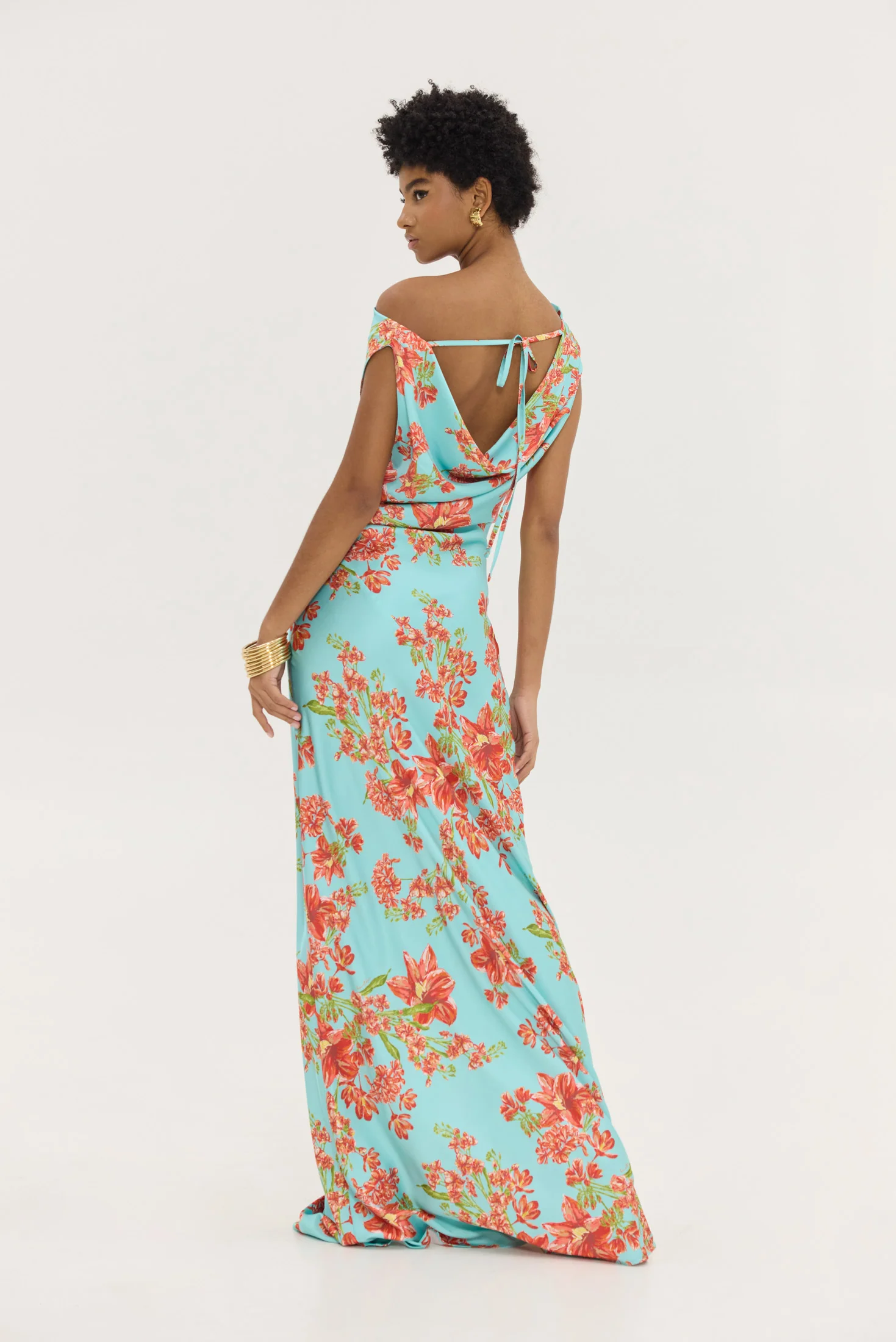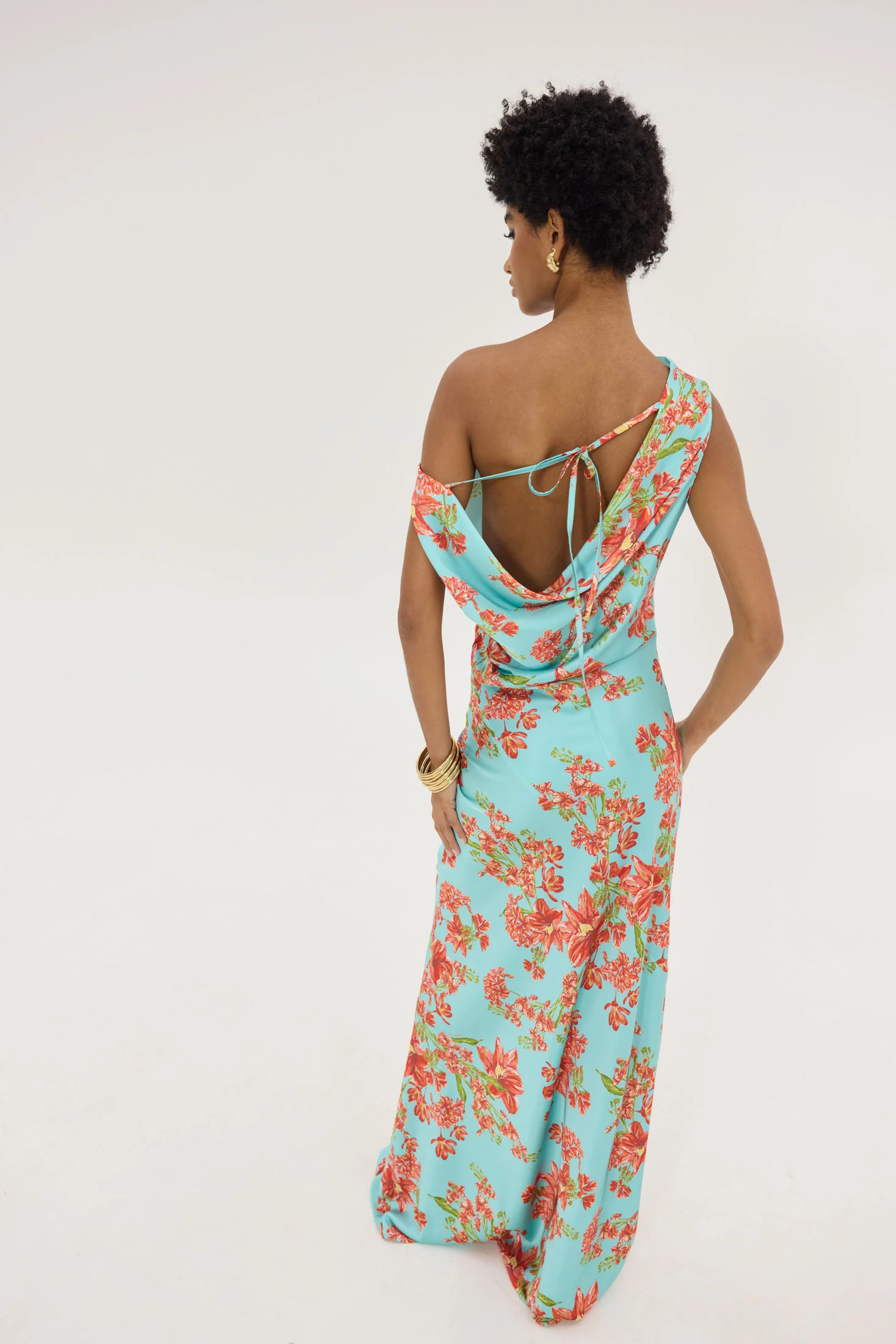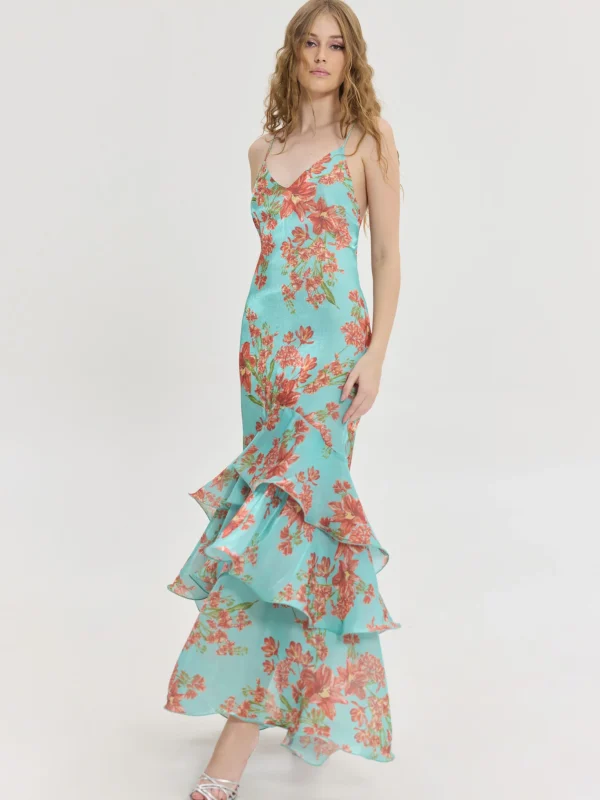 Maxi satin φόρεμα με floral print σε aqua φόντο.