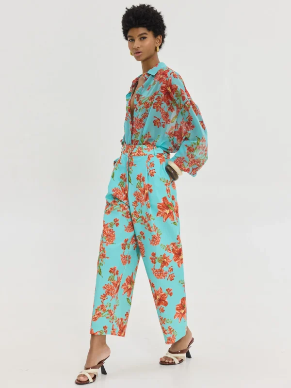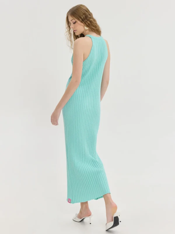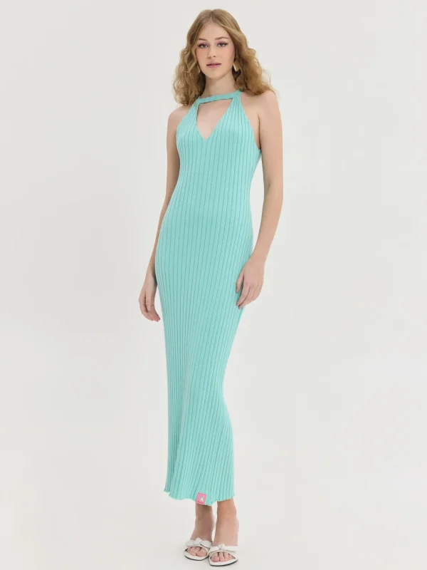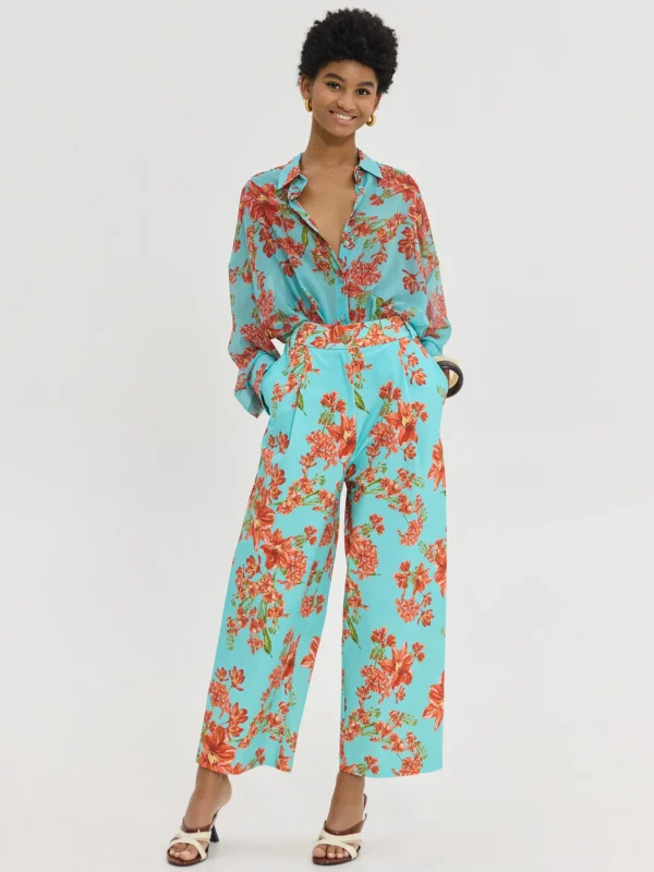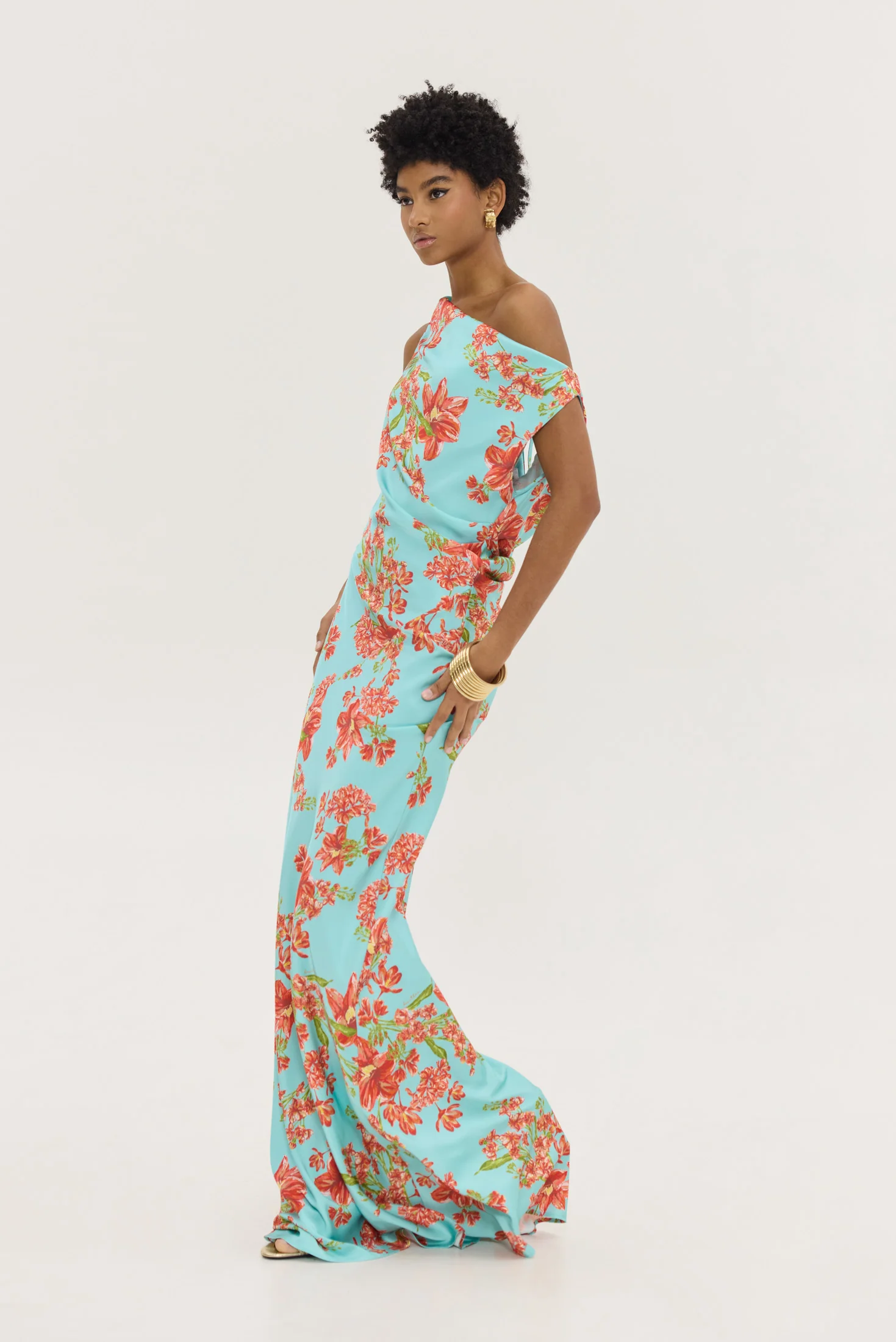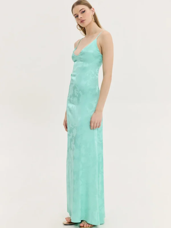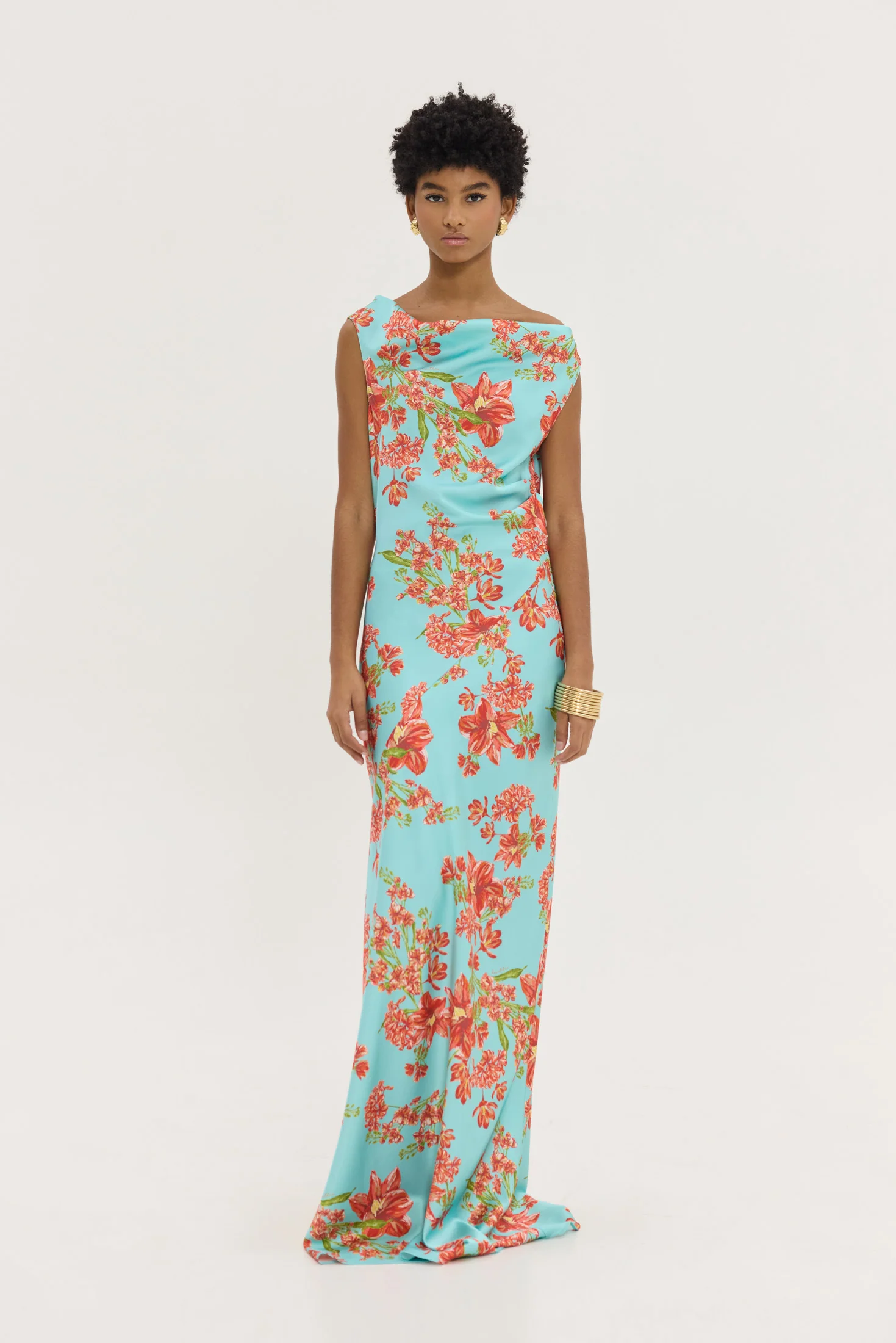 Maxi satin φόρεμα με floral print σε aqua φόντο.