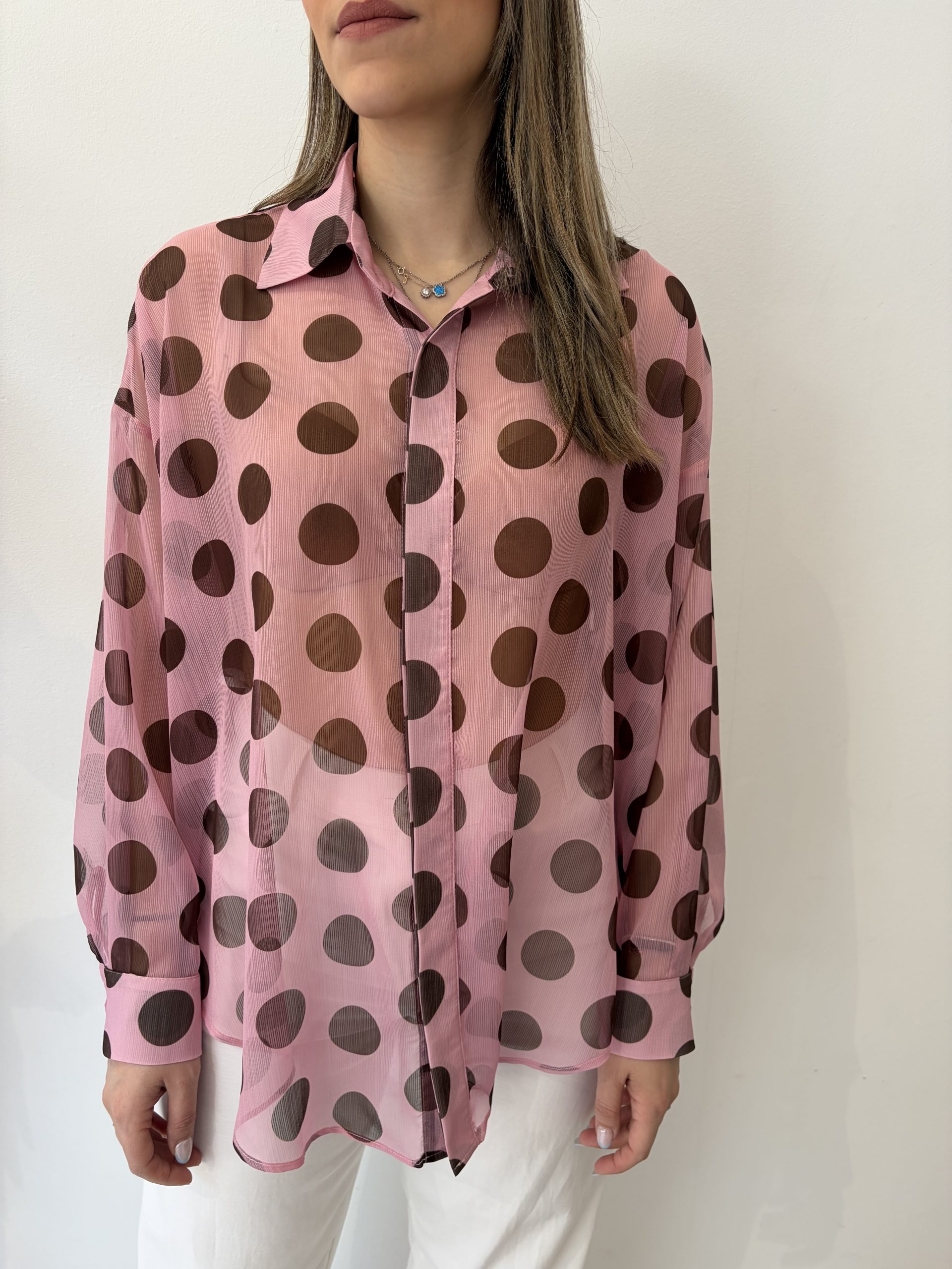 One size πουκάμισο καφέ πουά σε ροζ φόντο.