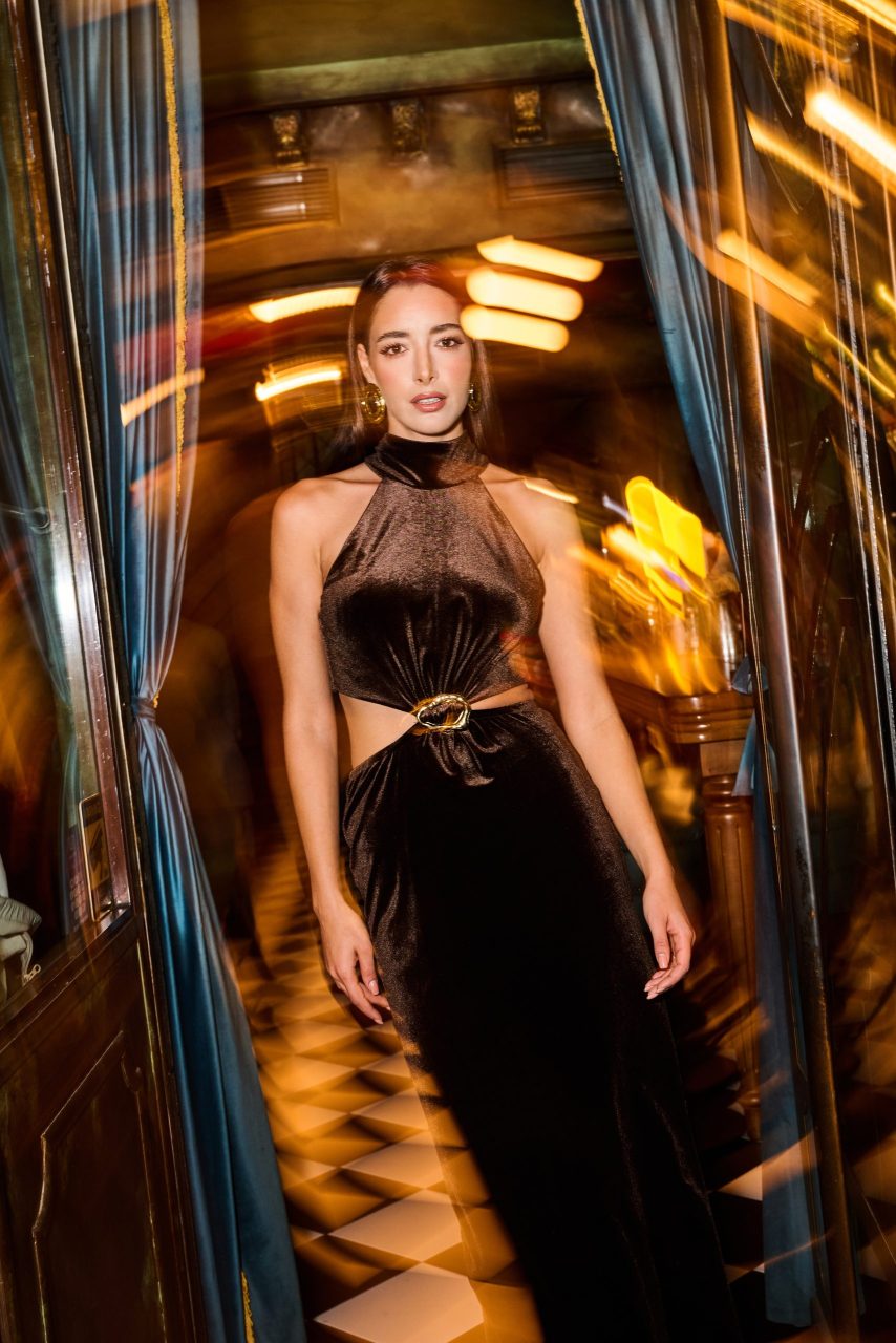 Βελουτέ φόρεμα με cut-out λεπτομέρειες σε καφέ και κυπαρισσί χρώμα.