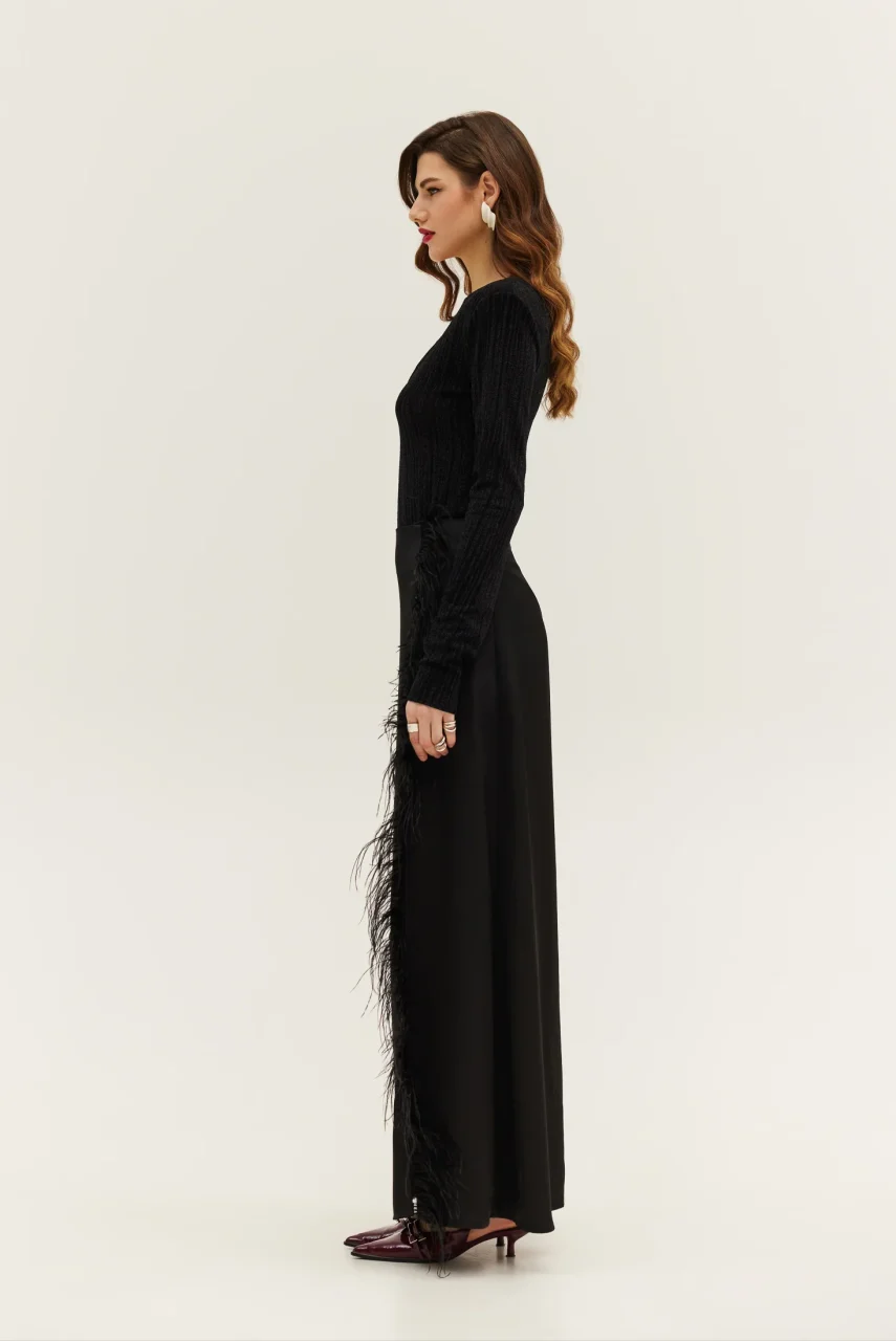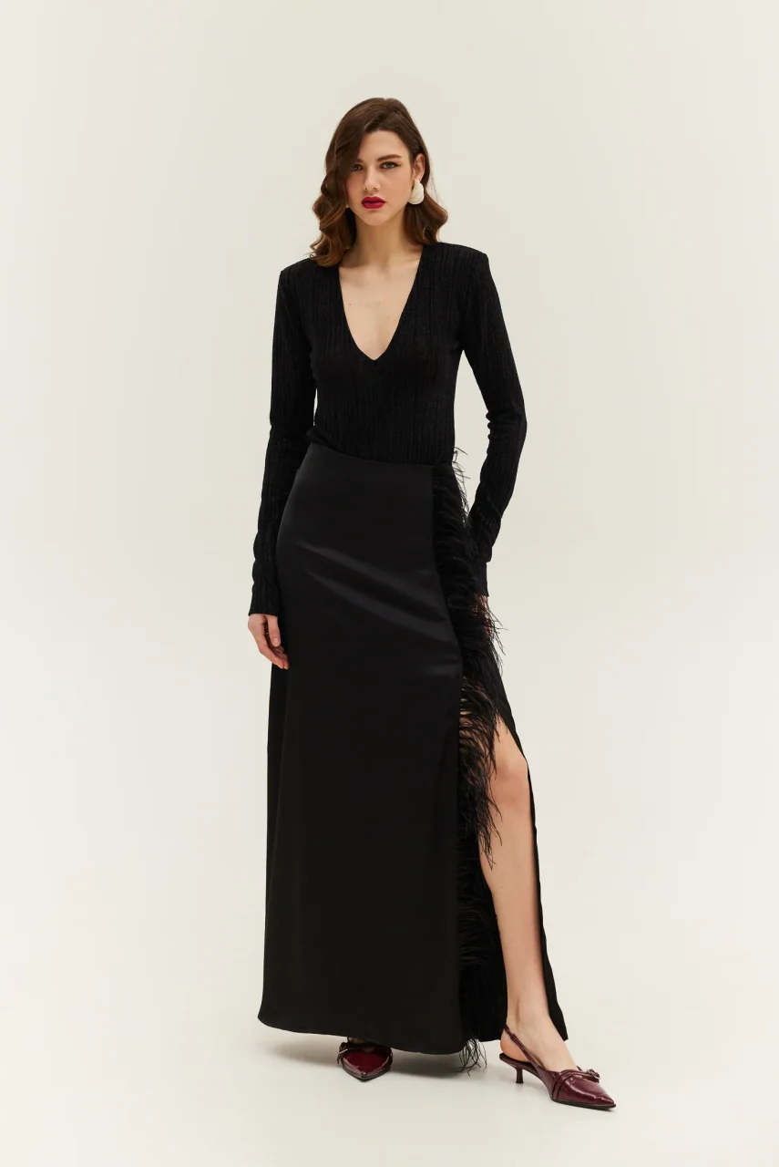 Μακριά φούστα σε μαύρο χρώμα με σατινέ ύφασμα και λεπτομέρειες με φτερά.