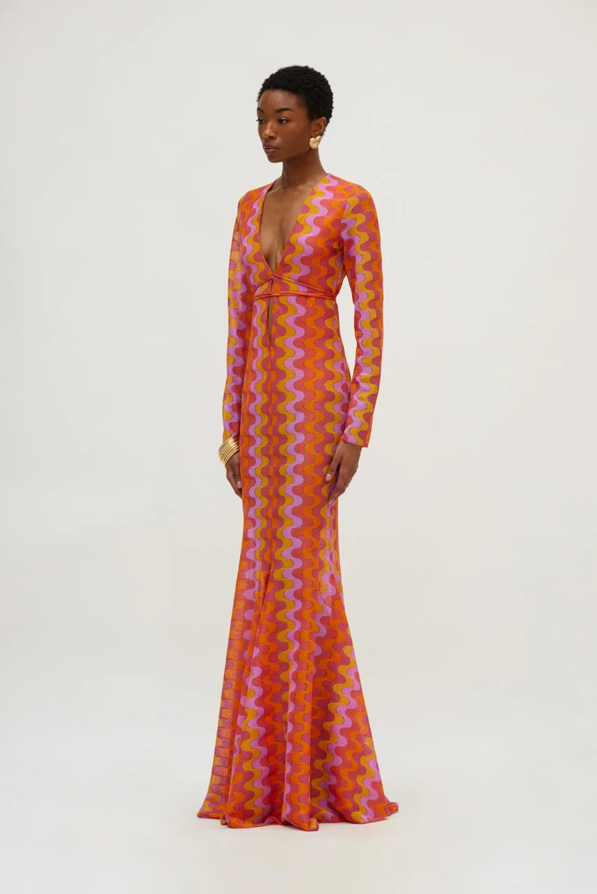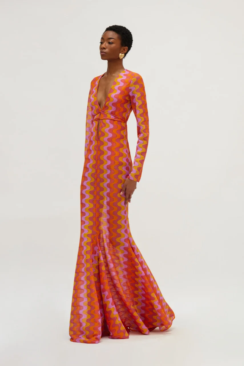 Maxi πλεκτό φόρεμα με χρυσοκλωστή σε αποχρώσεις του ροζ και του πορτοκαλί.