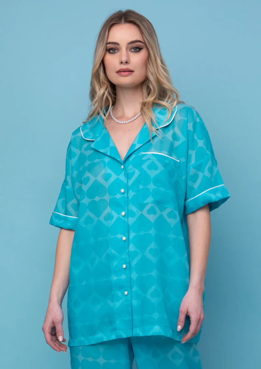 Κοντομάνικο πουκάμισο με μοτίβο σε τιρκουάζ φόντο.