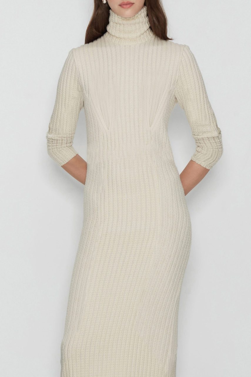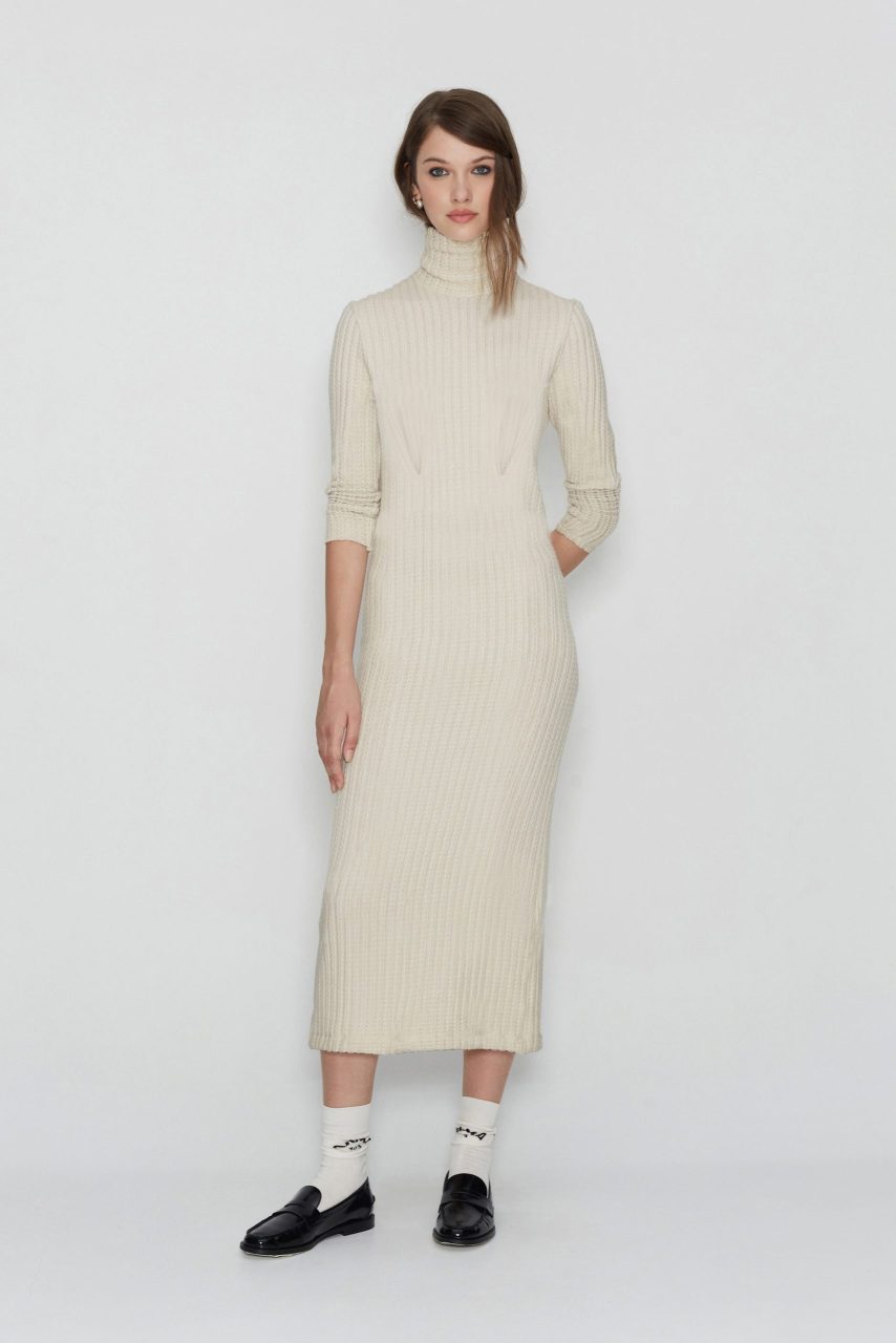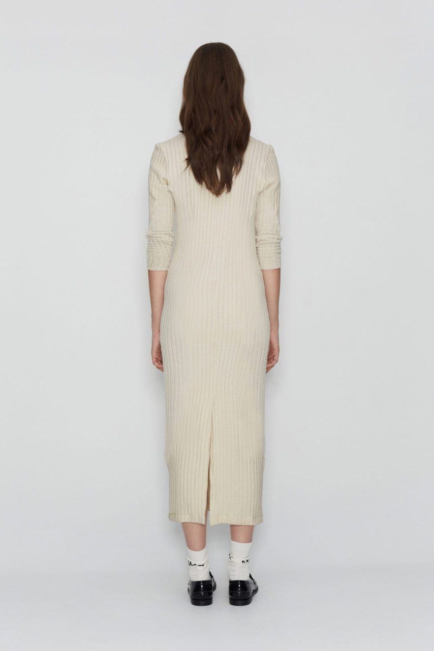 Πλεκτό μακρύ μπεζ φόρεμα.