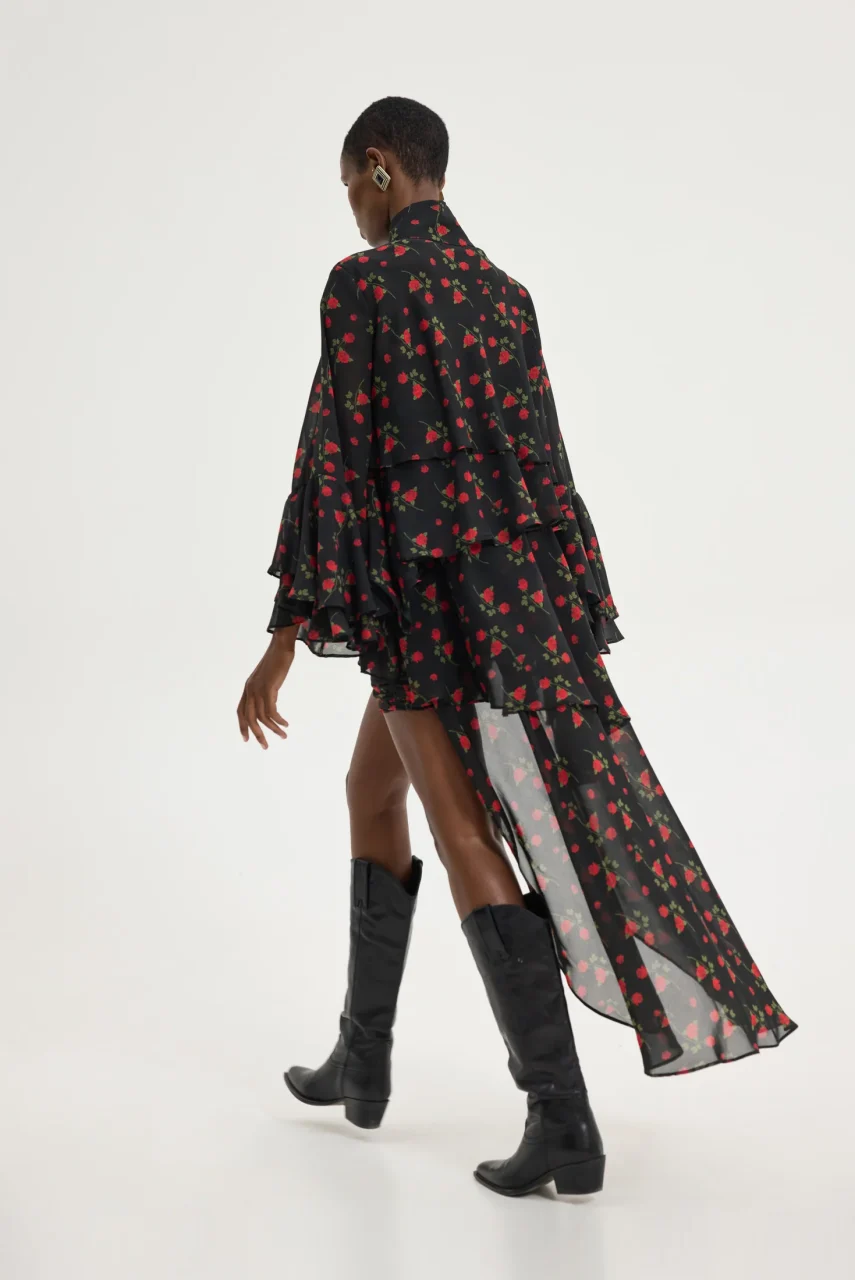 Ασύμμετρο τοπ με κόκκινα τριαντάφυλλα σε μαύρο φόντο.