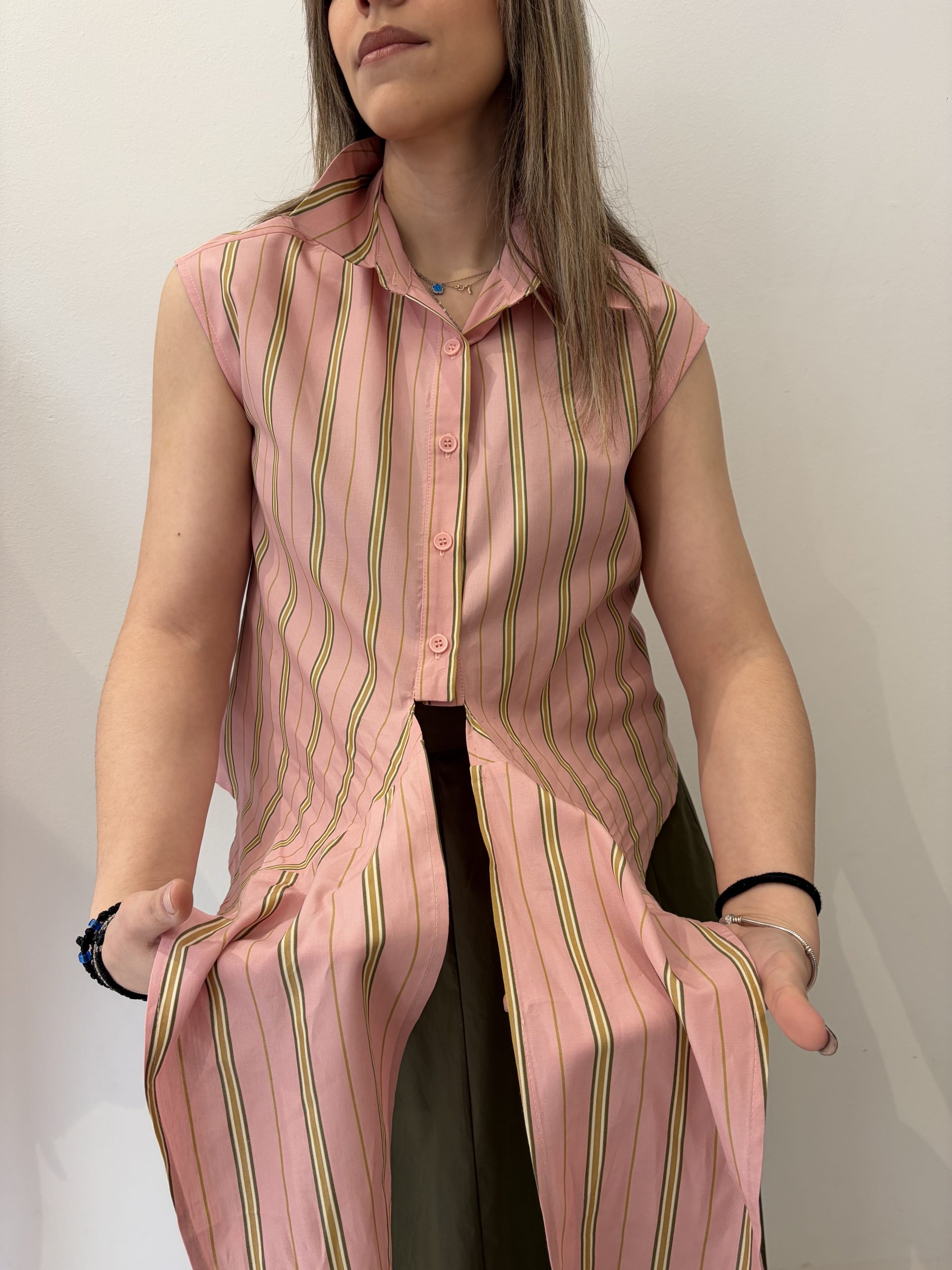 Αμάνικο πουκάμισο ριγέ ροζ με δέσιμο.