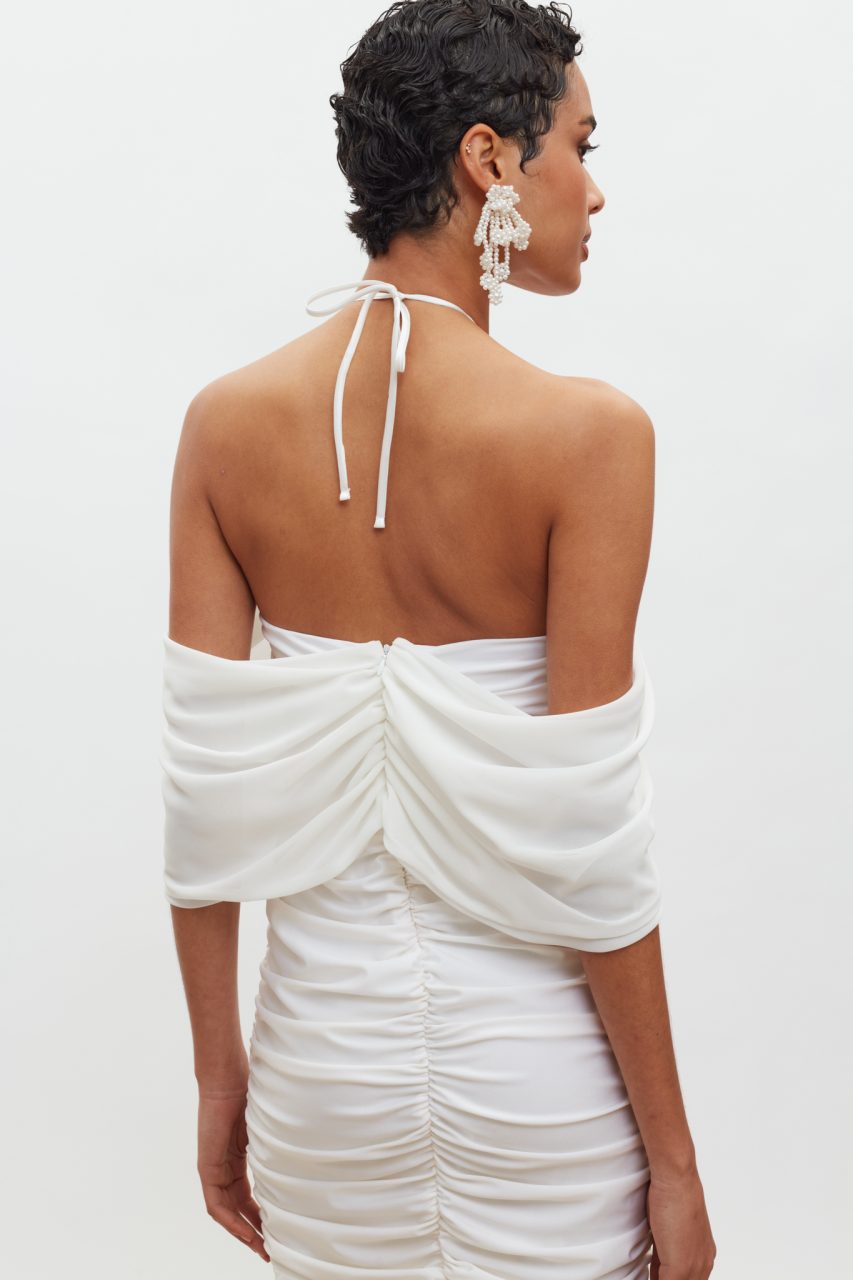 Mini φόρεμα με σούρες και δέσιμο στο λαιμό σε λευκό χρώμα.