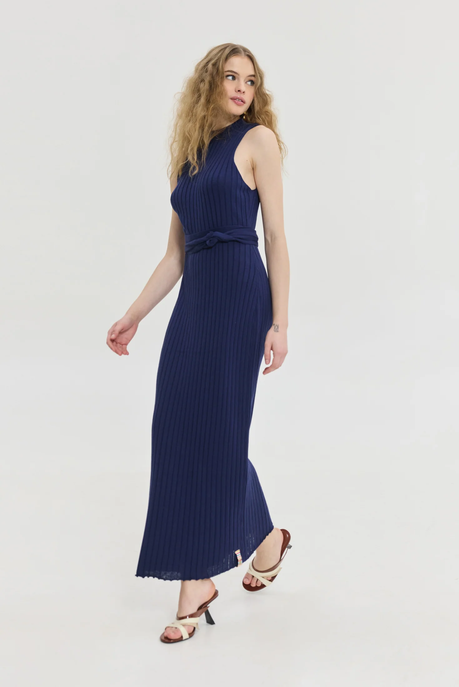 Πλεκτό φόρεμα αμάνικο με ανοιχτή πλάτη σε σκούρο μπλε χρώμα.
