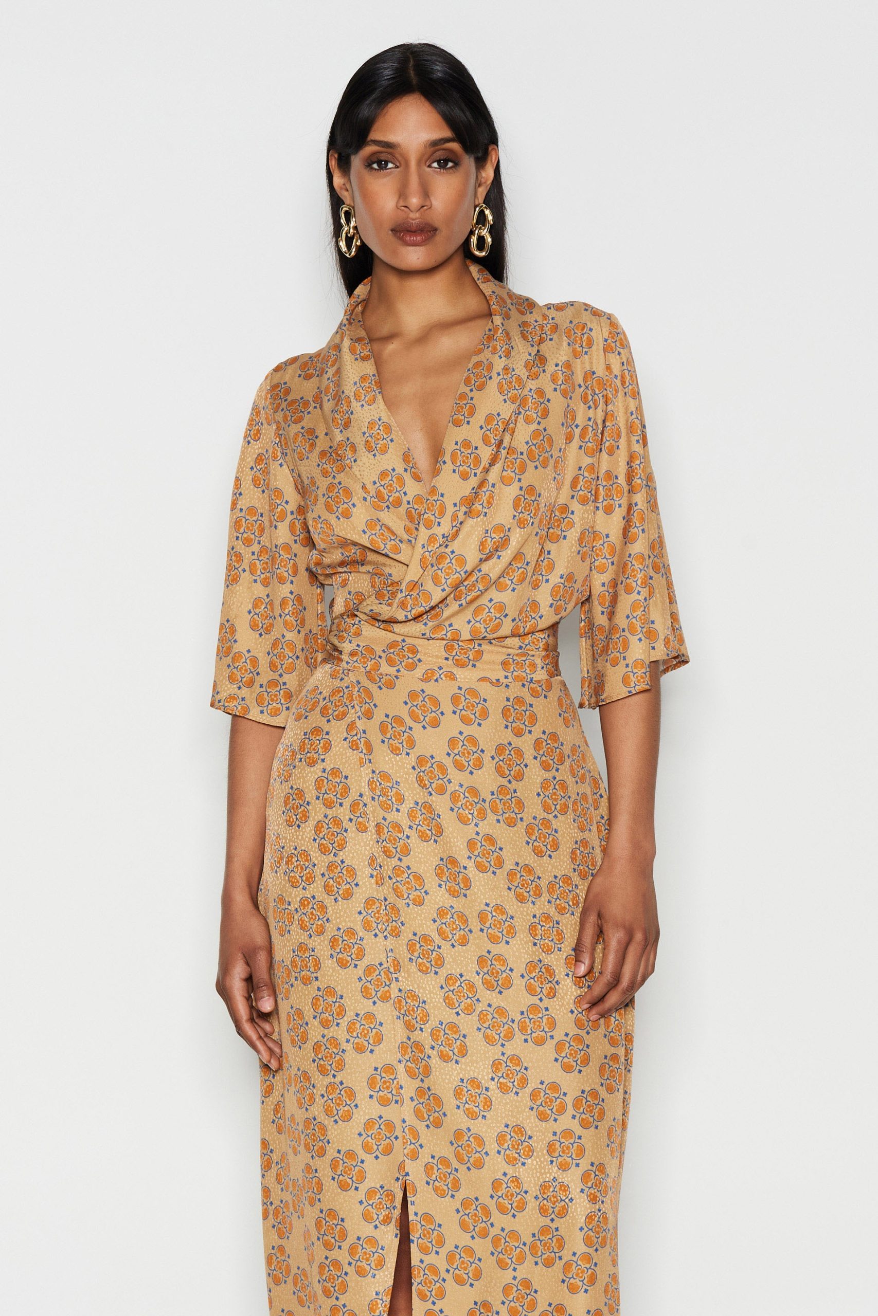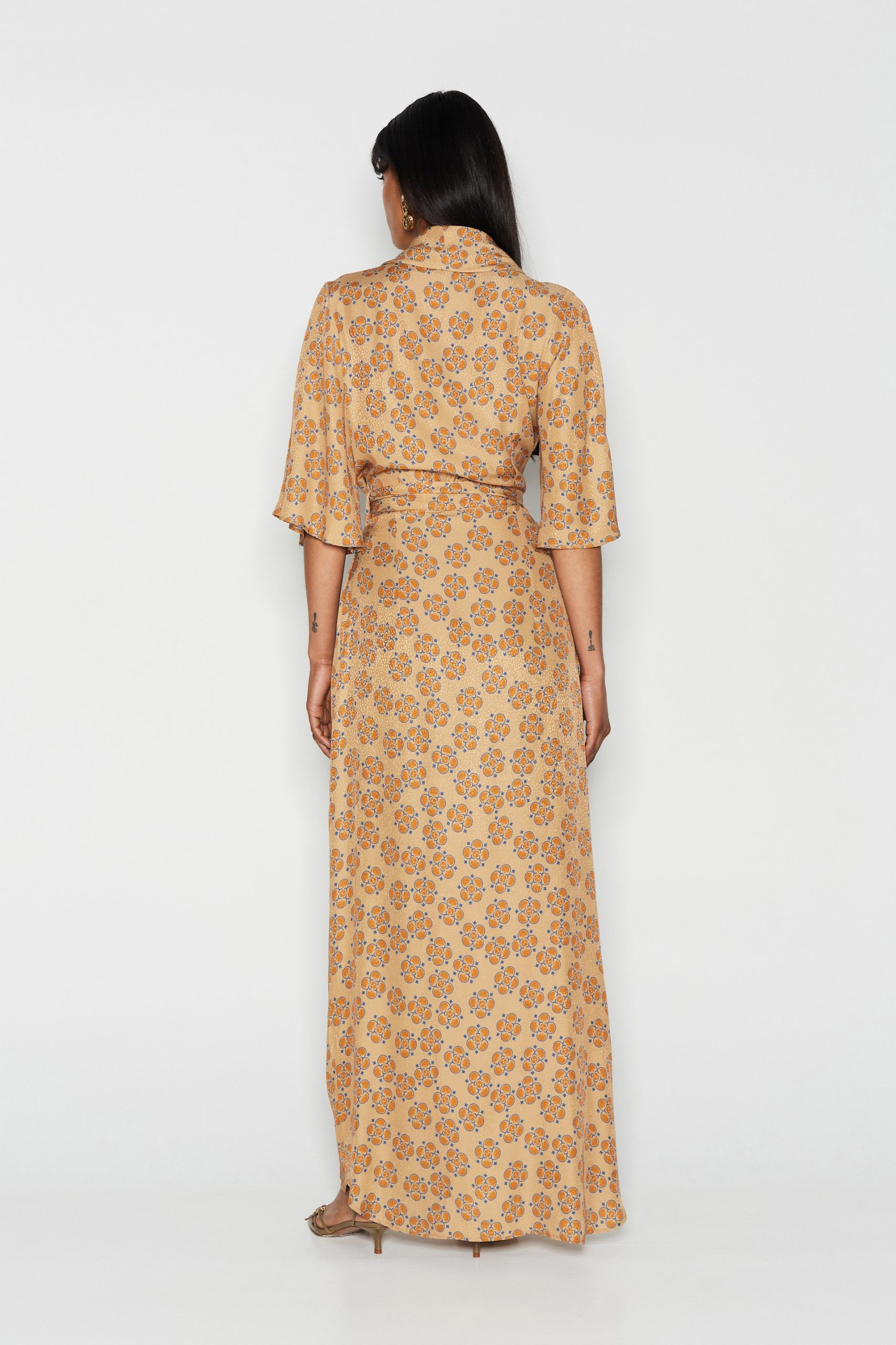 Χρυσό λουλουδάτο σατέν κρουαζέ φόρεμα.