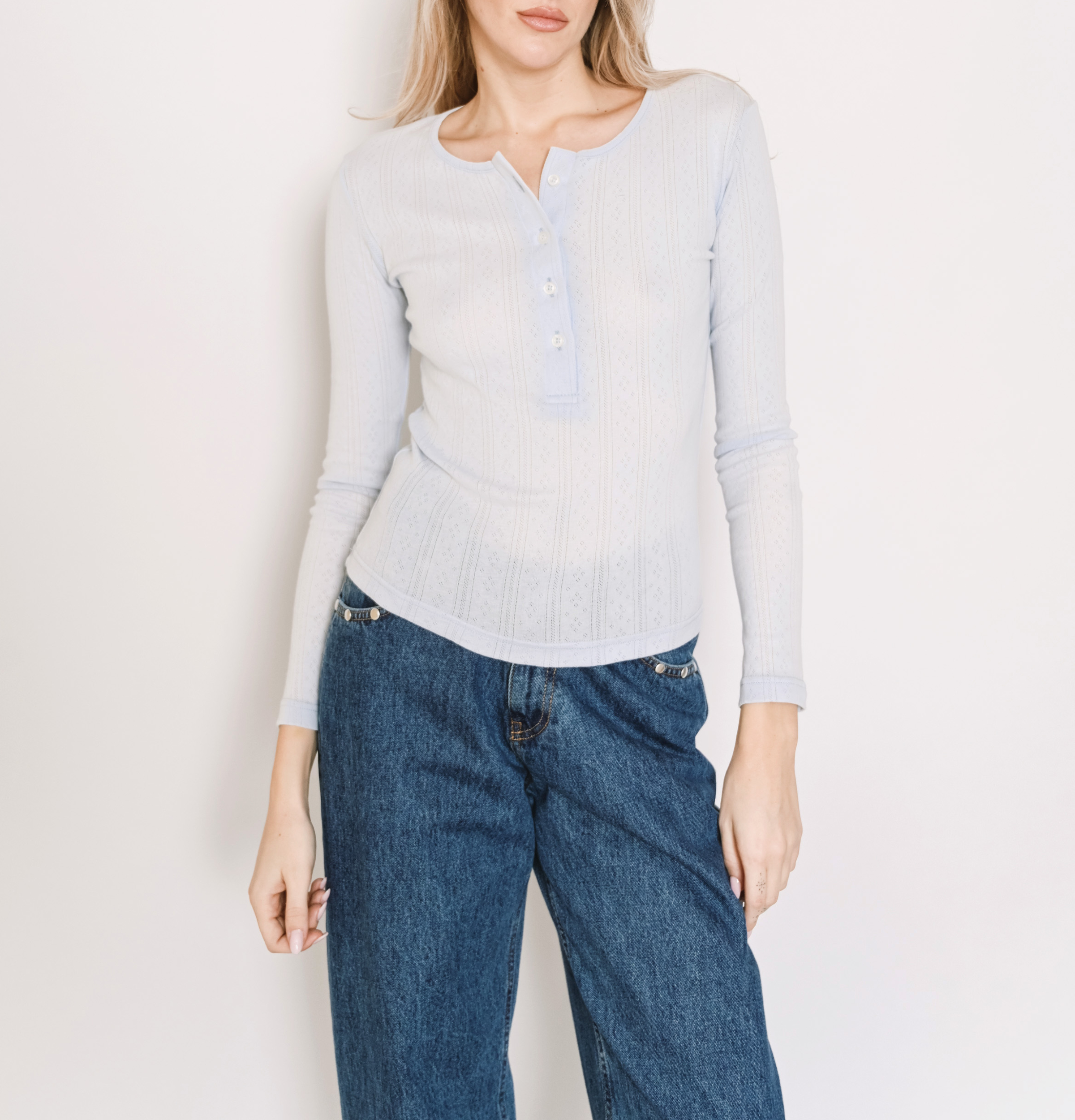 Μακρυμάνικο τοπ σε σιέλ χρώμα.