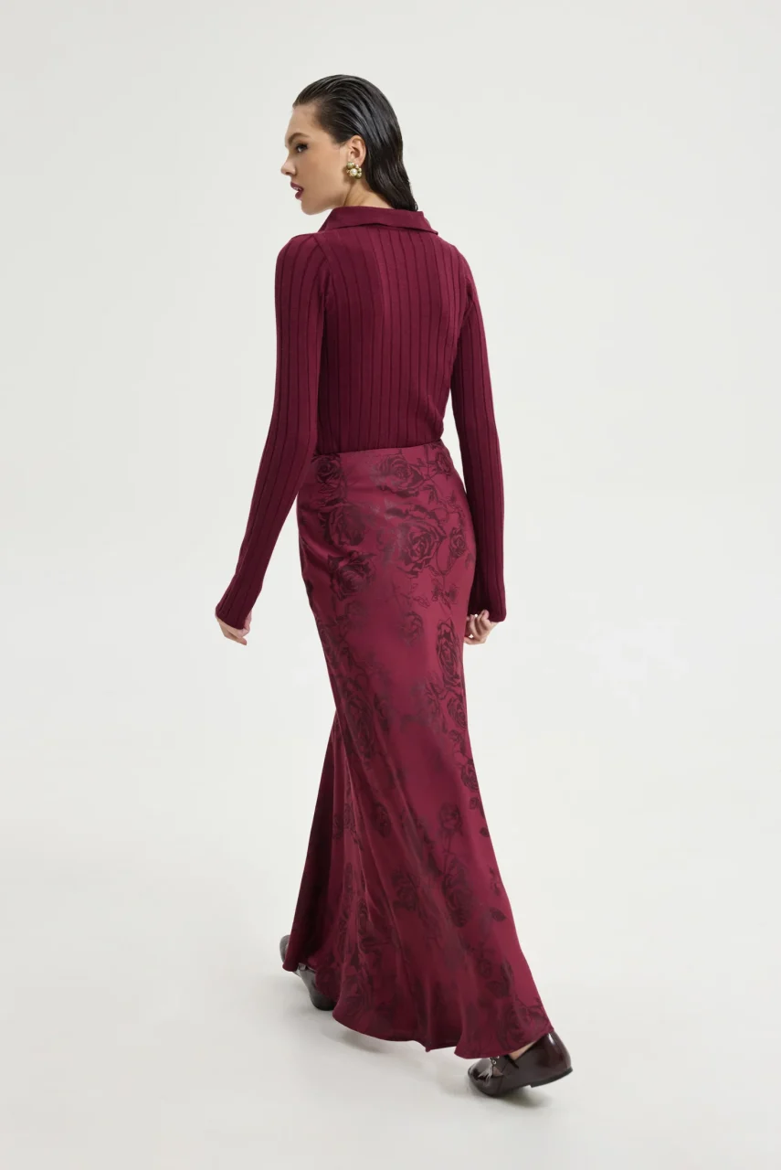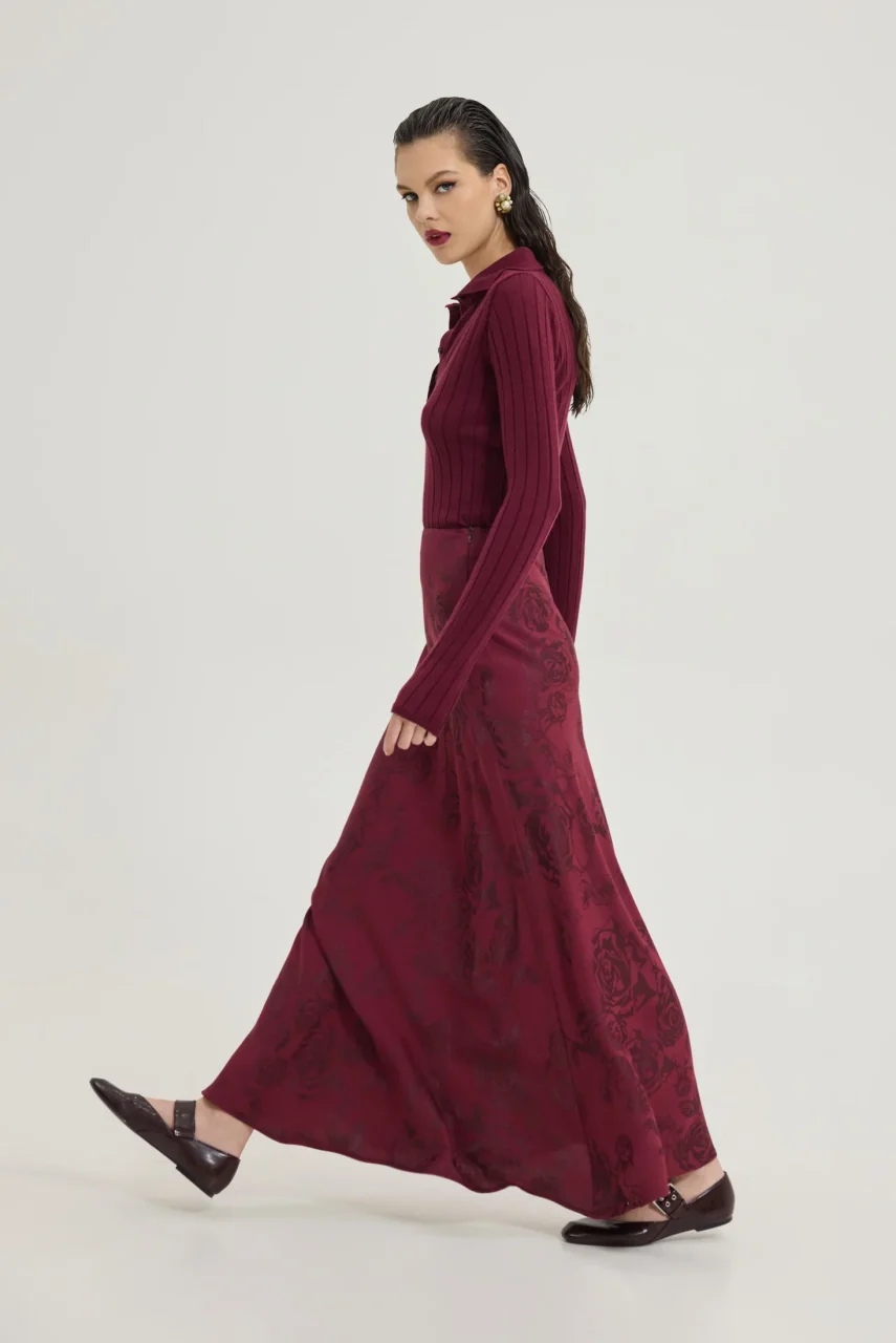 Maxi σατινέ φούστα με pattern λουλούδια σε μπορντό χρώμα.