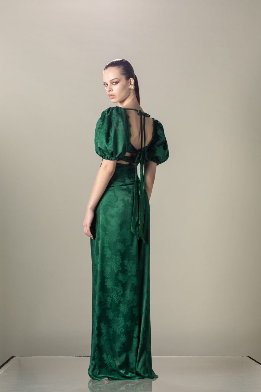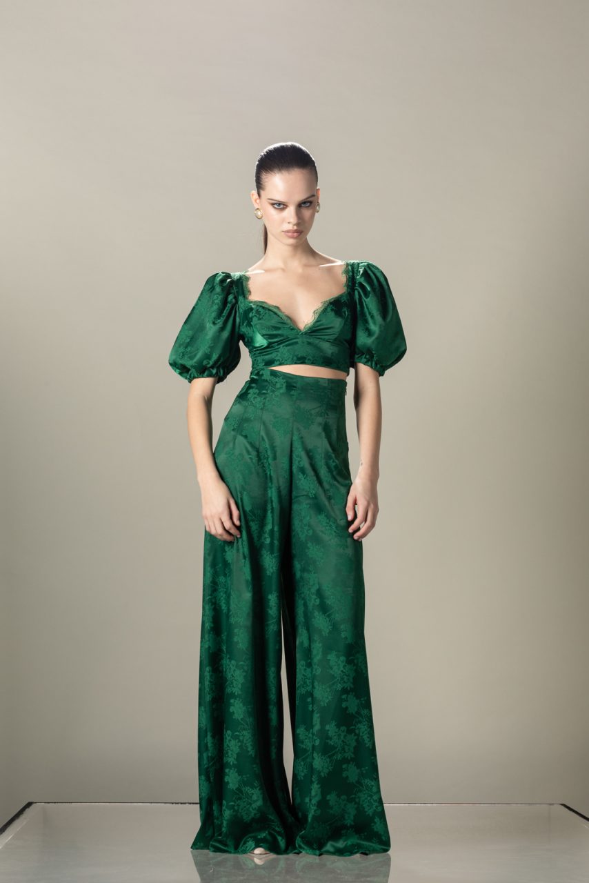 Ψηλόμεση παντελόνα σε σατινέ ύφασμα και πράσινο χρώμα.