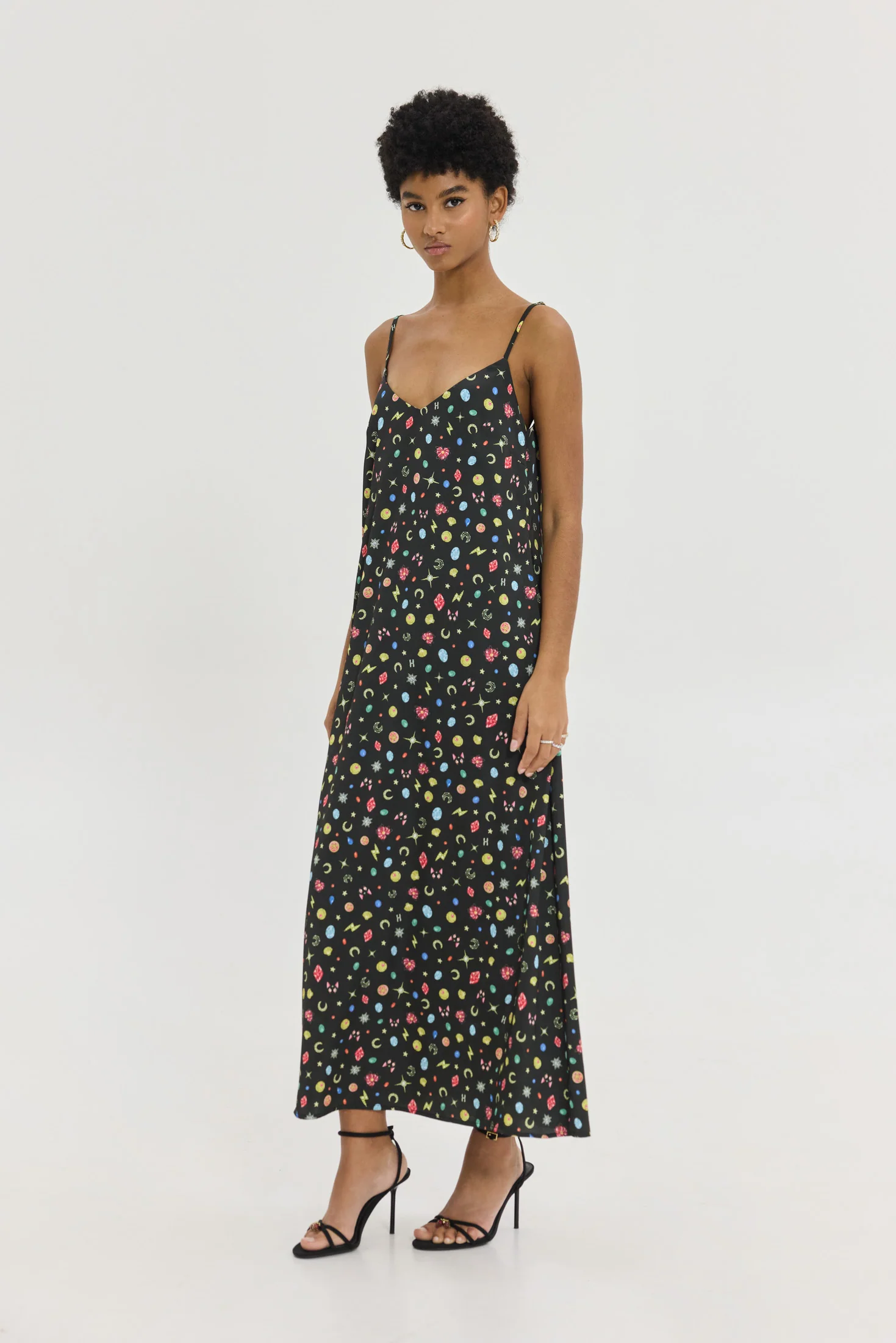 Σατινέ φόρεμα με μοτίβα σε μαύρο φόντο.