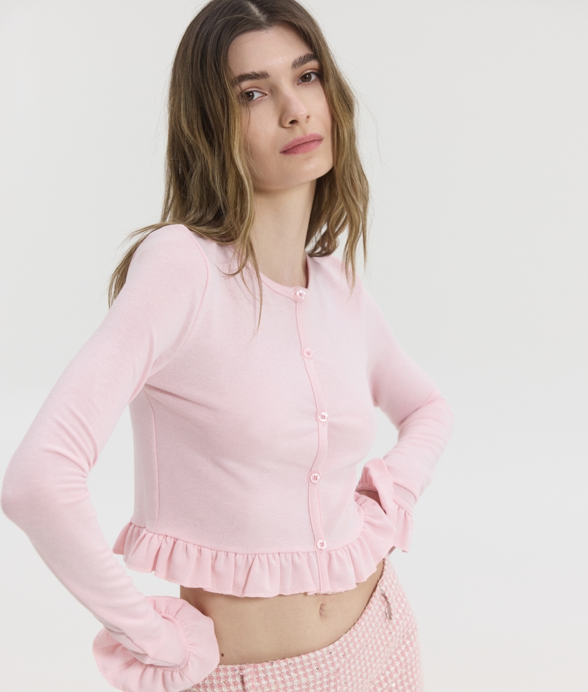Ζακέτα με βολάν σε ροζ χρώμα.