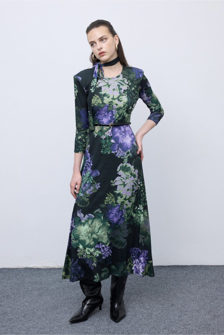 Midi jersey φόρεμα με floral print σε μαύρο φόντο.