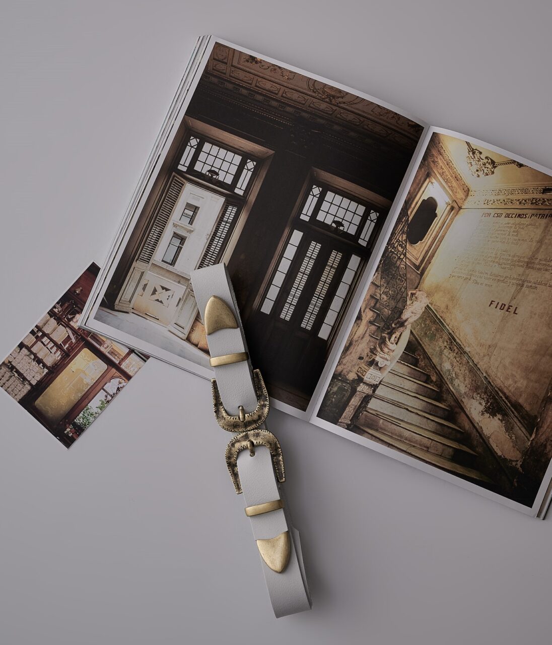 - Λευκή δερμάτινη ζώνη με μπρούτζινες λεπτομέρειες.