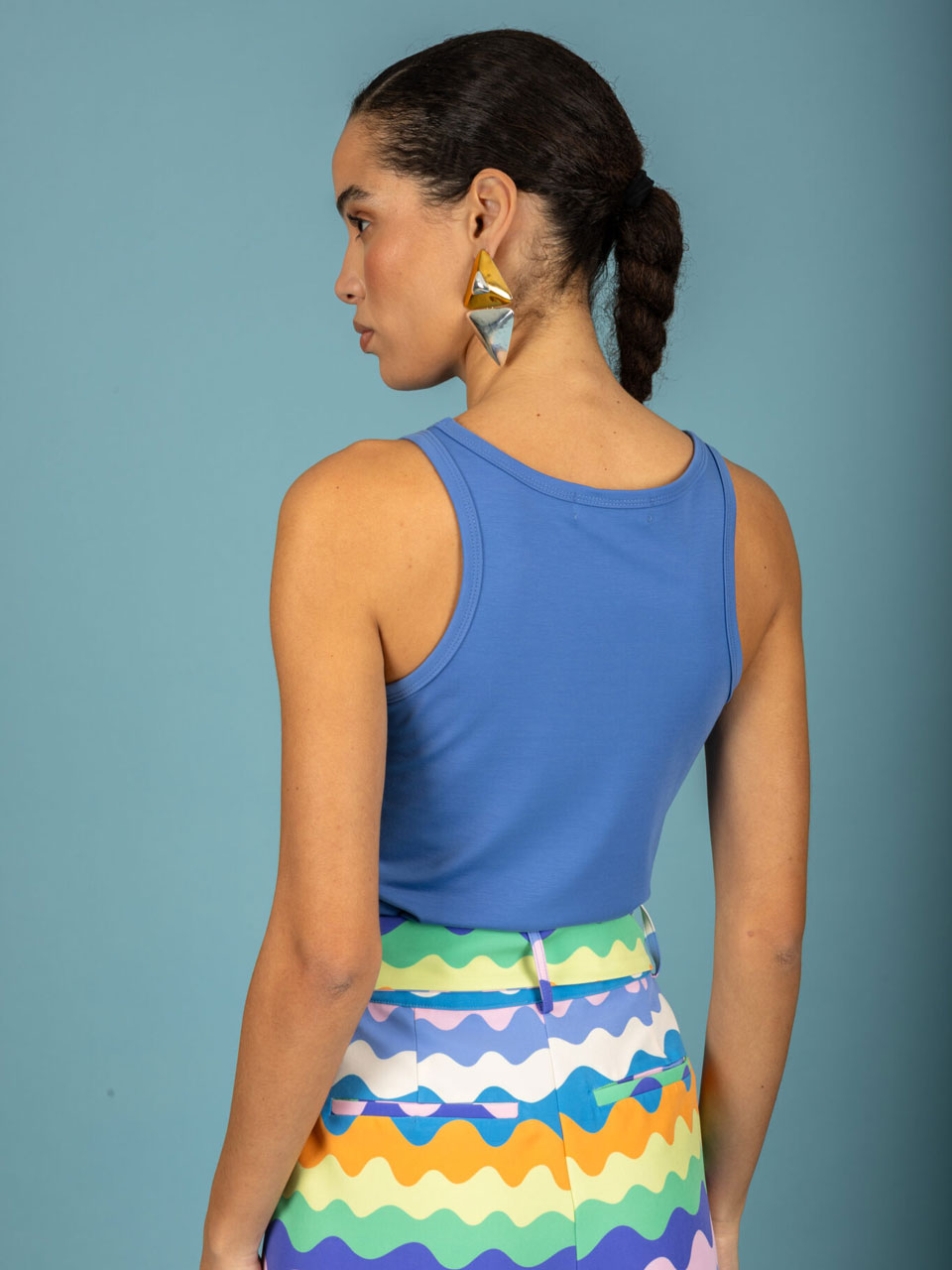 Αμάνικο τοπ σε σιέλ χρώμα.