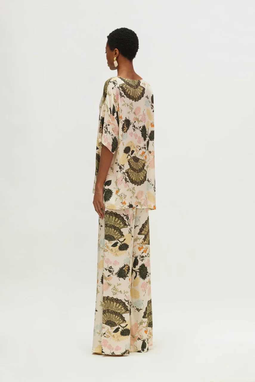 Ψηλόμεσο παντελόνι σε μαύρες βεντάλιες, λουλούδια σε κρεμ φόντο
